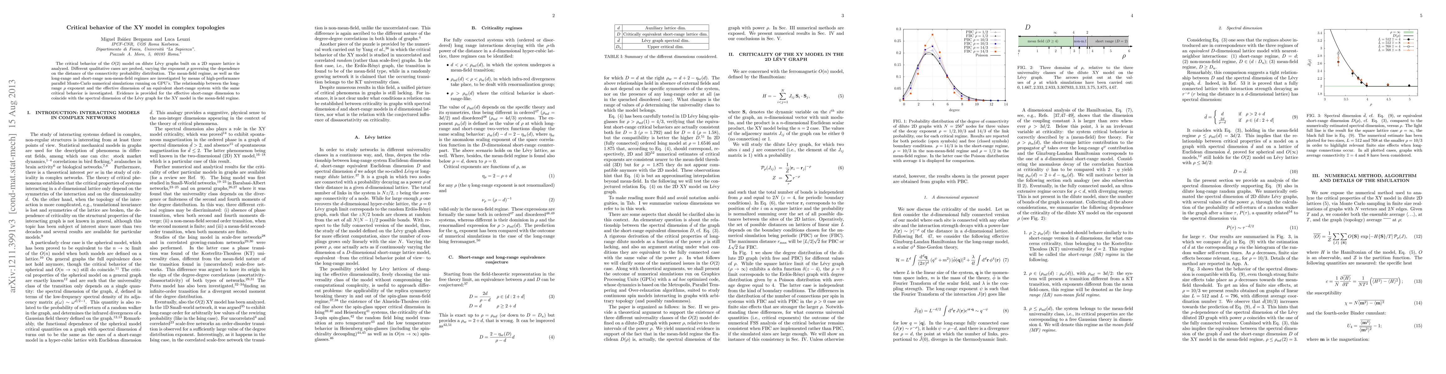The critical behavior of the O(2) model on dilute Levy graphs built on a 2D square lattice is analyzed. Different qualitative cases are probed, varying the exponent rho governing the dependence on the distance of the connectivity probability distribution. The mean-field regime, as well as the long-range and short-range non-mean-field regimes are investigated by means of high-performance parallel Monte-Carlo numerical simulations running on GPUs. The relationship between the long-range rho exponent and the effective dimension of an equivalent short-range system with the same critical behavior is investigated. Evidence is provided for the effective short-range dimension to coincide with the spectral dimension of the Levy graph for the XY model in the mean-field regime.