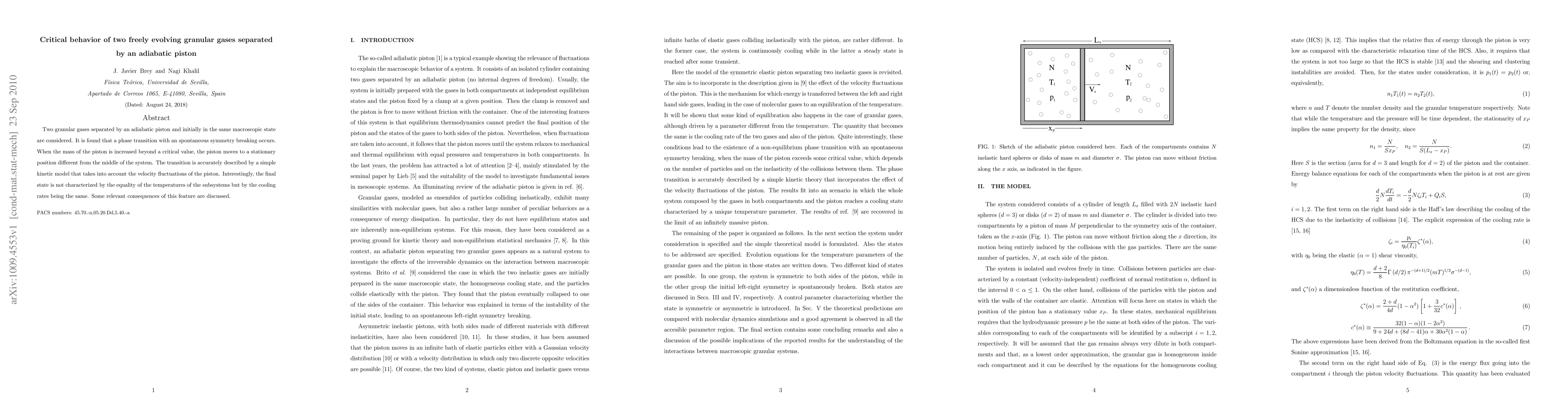 This study investigates the critical behavior of two granular gases divided by an adiabatic piston, revealing a phase transition with spontaneous symmetry breaking. When the piston mass exceeds a critical value, it stabilizes at a position away from the center, leading to cooling rates equalizing rather than temperature equality between the subsystems.