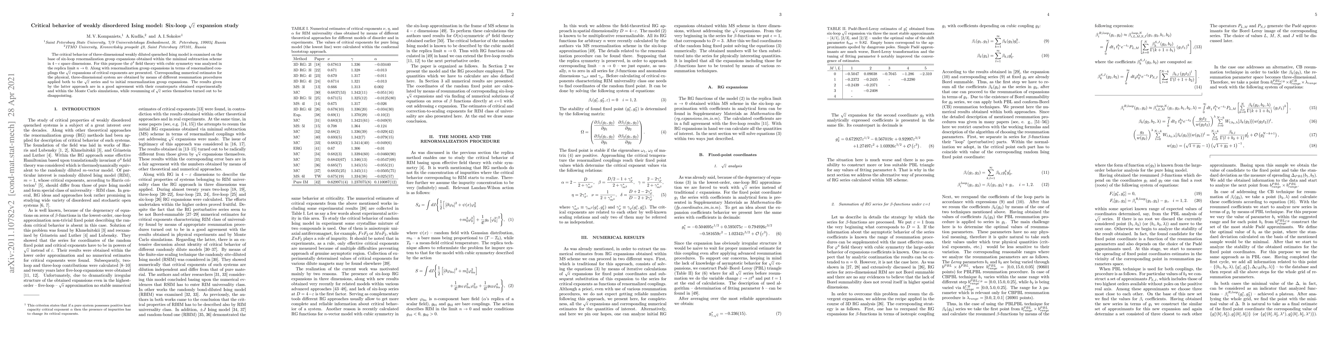 This paper investigates the critical behavior of a three-dimensional weakly disordered Ising model using six-loop renormalization group expansions in the $4-\epsilon$ space. The study provides numerical estimates for critical exponents and compares results with experimental and Monte Carlo simulation data, finding good agreement.