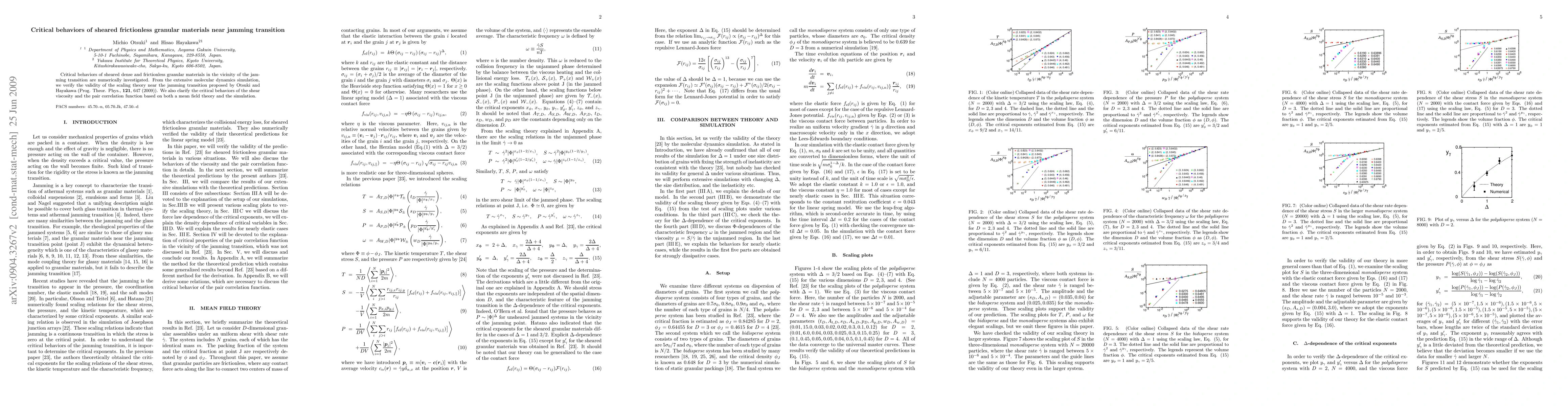 Critical behaviors of sheared dense and frictionless granular materials in the vicinity of the jamming transition are numerically investigated. From the extensive molecular dynamics simulation, we verify the validity of the scaling theory near the jamming transition proposed by Otsuki and Hayakawa (Prog. Theor. Phys., 121, 647 (2009)). We also clarify the critical behaviors of the shear viscosity and the pair correlation function based on both a phenomenology and the simulation.