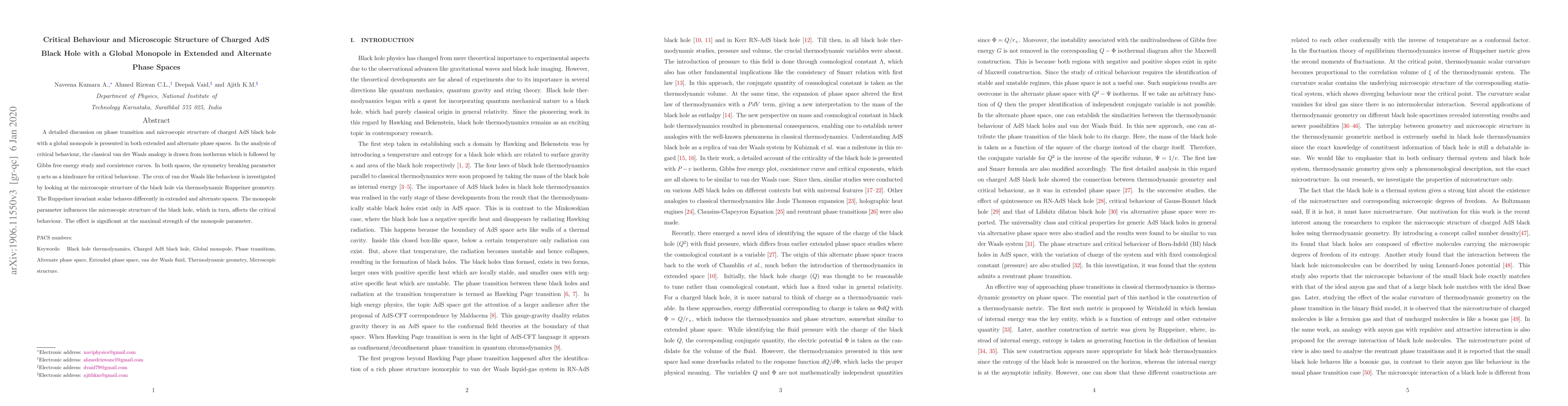 A detailed discussion on phase transition and microscopic structure of charged AdS black hole with a global monopole is presented in both extended and alternate phase spaces. In the analysis of critical behaviour, the classical van der Waals analogy is drawn from isotherms which is followed by Gibbs free energy study and coexistence curves. In both spaces, the symmetry breaking parameter $\eta$ acts as a hindrance for critical behaviour. The crux of van der Waals like behaviour is investigated by looking at the microscopic structure of the black hole via thermodynamic Ruppeiner geometry. The Ruppeiner invariant scalar behaves differently in extended and alternate spaces. The monopole parameter influences the microscopic structure of the black hole, which in turn, affects the critical behaviour. The effect is significant at the maximal strength of the monopole parameter.