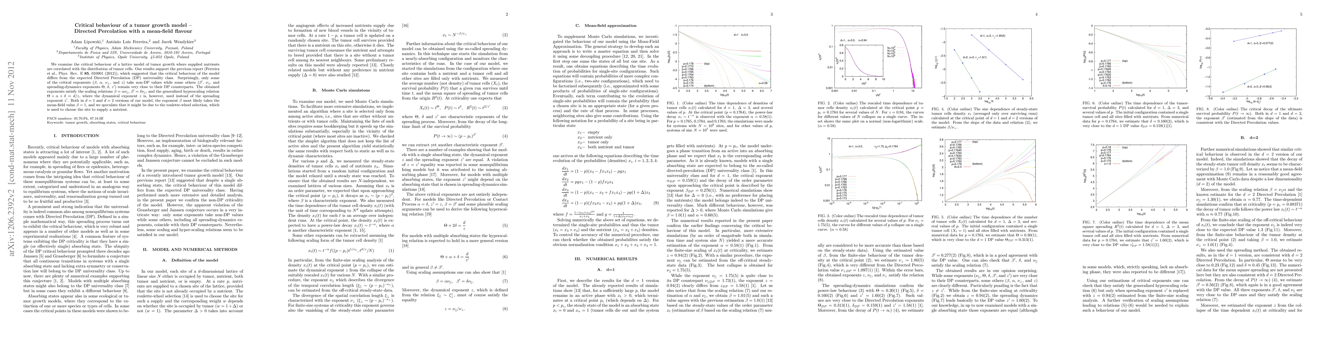 We examine the critical behaviour of a lattice model of tumor growth where supplied nutrients are correlated with the distribution of tumor cells. Our results support the previous report (Ferreira et al., Phys. Rev. E 85, 010901 (2012)), which suggested that the critical behaviour of the model differs from the expected Directed Percolation (DP) universality class. Surprisingly, only some of the critical exponents (beta, alpha, nu_perp, and z) take non-DP values while some others (beta', nu_||, and spreading-dynamics exponents Theta, delta, z') remain very close to their DP counterparts. The obtained exponents satisfy the scaling relations beta=alpha*nu_||, beta'=delta*nu_||, and the generalized hyperscaling relation Theta+alpha+delta=d/z, where the dynamical exponent z is, however, used instead of the spreading exponent z'. Both in d=1 and d=2 versions of our model, the exponent beta most likely takes the mean-field value beta=1, and we speculate that it might be due to the roulette-wheel selection, which is used to choose the site to supply a nutrient.