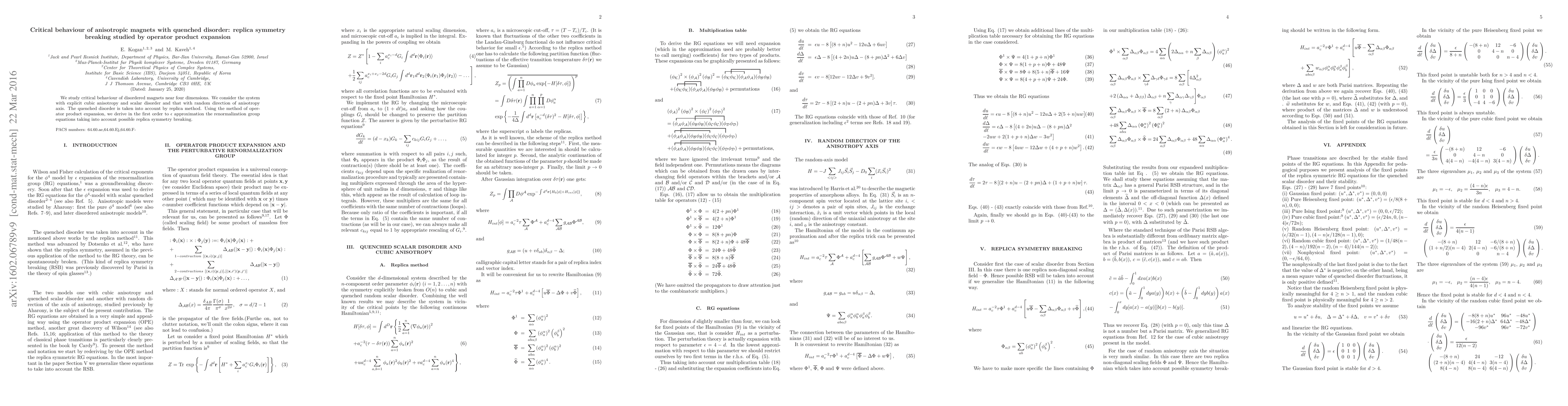 This paper investigates the critical behavior of anisotropic magnets with quenched disorder near four dimensions, focusing on systems with cubic anisotropy and scalar disorder. The study employs the replica method and operator product expansion to derive renormalization group equations considering replica symmetry breaking.
