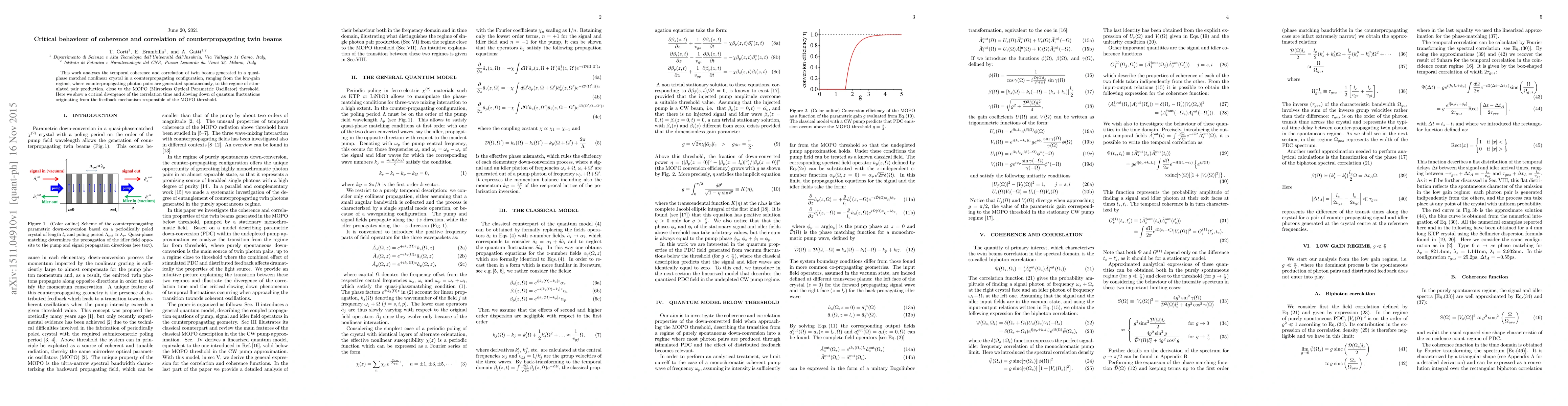 This paper investigates the temporal coherence and correlation of twin beams in a counterpropagating configuration, revealing a critical divergence in correlation time and a slowdown of quantum fluctuations as the system approaches the MOPO threshold, attributed to the feedback mechanism.