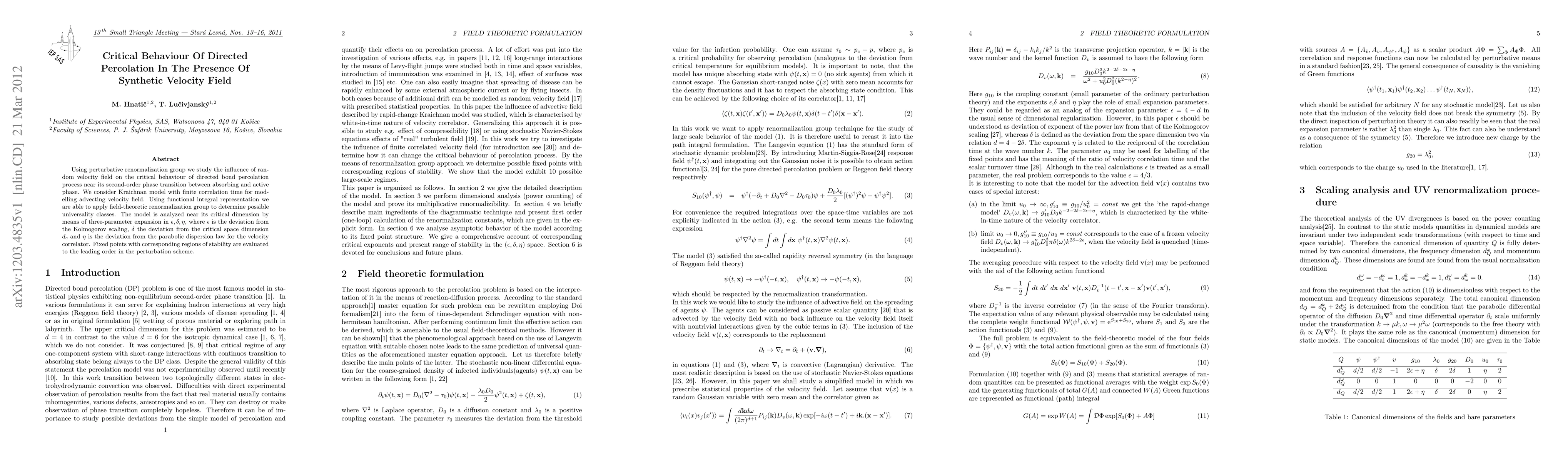 This paper investigates the critical behavior of directed bond percolation under the influence of a synthetic velocity field, employing perturbative renormalization group methods. The study uses the Kraichnan model to model the advecting velocity field and determines universality classes via functional integral representation and field-theoretic renormalization group analysis.