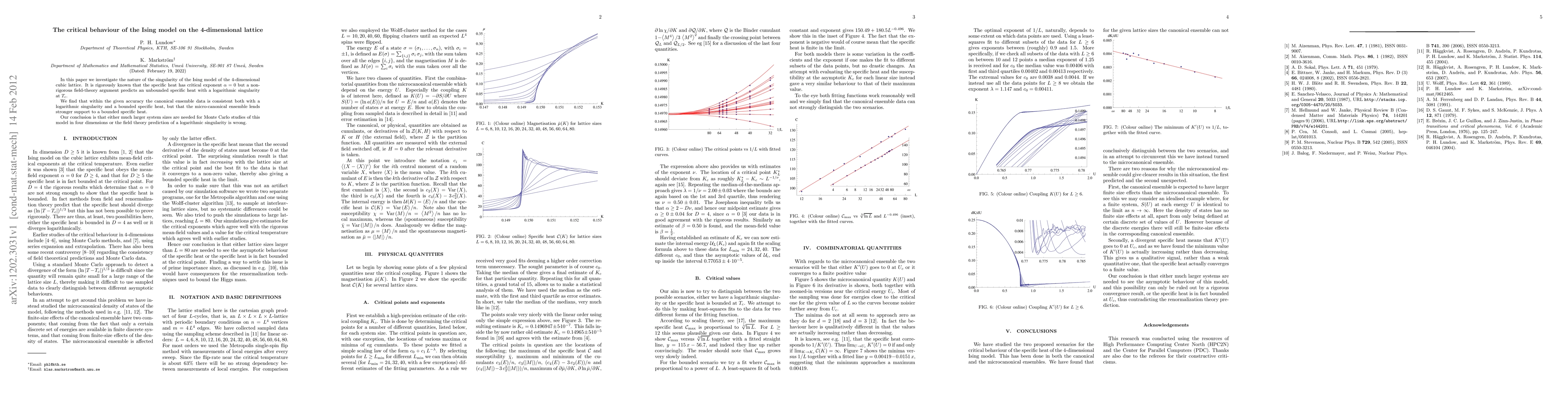 In this paper we investigate the nature of the singularity of the Ising model of the 4-dimensional cubic lattice. It is rigorously known that the specific heat has critical exponent $\alpha=0$ but a non-rigorous field-theory argument predicts an unbounded specific heat with a logarithmic singularity at $T_c$. We find that within the given accuracy the canonical ensemble data is consistent both with a logarithmic singularity and a bounded specific heat, but that the micro-canonical ensemble lends stronger support to a bounded specific heat. Our conclusion is that either much larger system sizes are needed for Monte Carlo studies of this model in four dimensions or the field theory prediction of a logarithmic singularity is wrong.