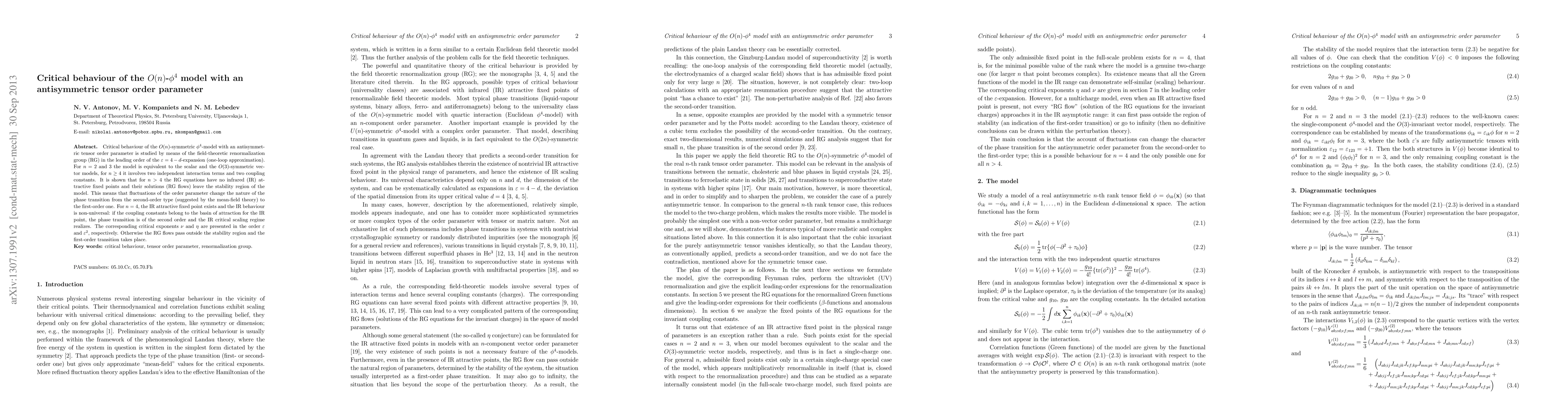 The study investigates the critical behavior of the O(n)-symmetric $\phi^{4}$ model with an antisymmetric tensor order parameter using the field-theoretic renormalization group in the one-loop approximation. For n > 4, the model lacks infrared attractive fixed points, suggesting a shift from second-order to first-order phase transitions due to order parameter fluctuations. For n = 4, the presence of an IR attractive fixed point allows for a second-order transition and critical scaling, while other coupling constants lead to first-order transitions.