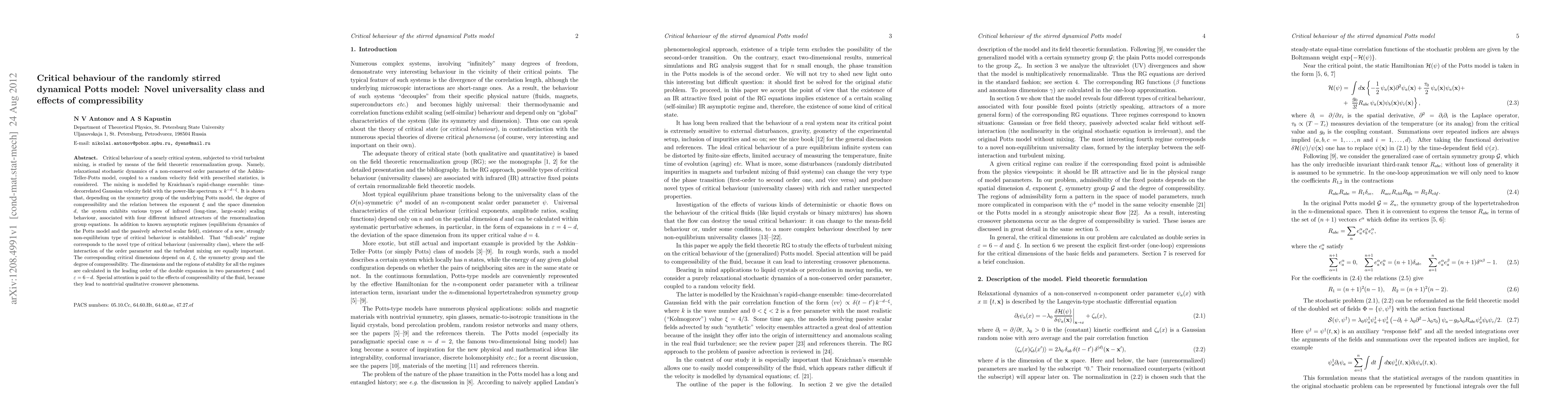 This paper investigates the critical behaviour of the dynamically stirred Potts model under turbulent mixing, revealing a novel universality class. It identifies four distinct infrared scaling regimes, including a new, non-equilibrium type, dependent on the symmetry group and compressibility, with critical dimensions calculated for stability regions.