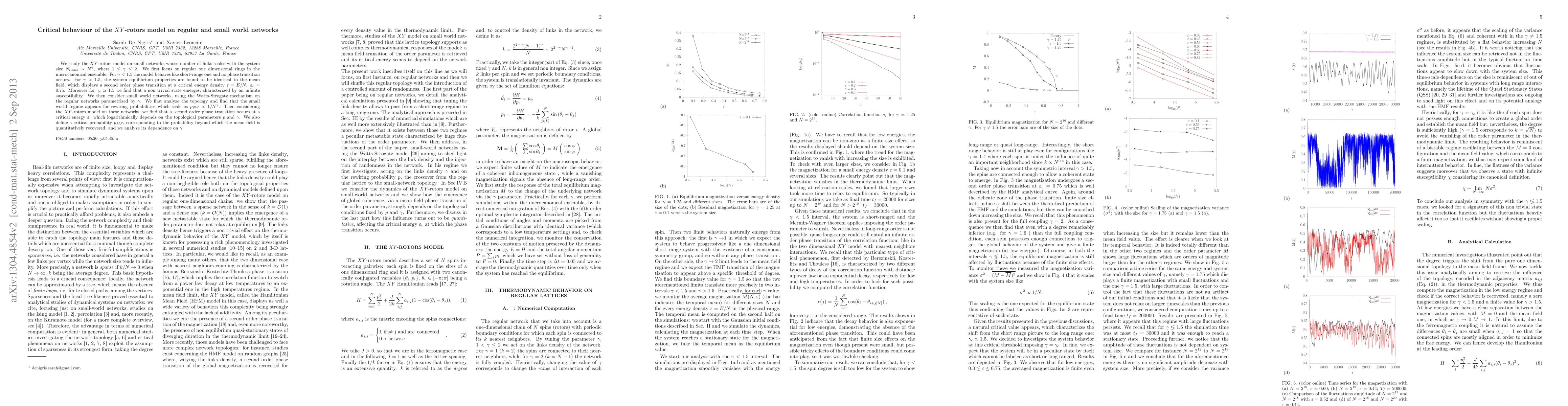 We study the XY-rotors model on small networks whose number of links scales with the system size $N_{links}\sim N^{\gamma}$, where $1\le\gamma\le2$. We first focus on regular one dimensional rings in the microcanonical ensemble. For $\gamma<1.5$ the model behaves like short-range one and no phase transition occurs. For $\gamma>1.5$, the system equilibrium properties are found to be identical to the mean field, which displays a second order phase transition at a critical energy density $\varepsilon=E/N, \varepsilon_{c}=0.75$. Moreover for $\gamma_{c}\simeq1.5$ we find that a non trivial state emerges, characterized by an infinite susceptibility. We then consider small world networks, using the Watts-Strogatz mechanism on the regular networks parametrized by $\gamma$. We first analyze the topology and find that the small world regime appears for rewiring probabilities which scale as $p_{SW}\propto1/N^{\gamma}$. Then considering the XY-rotors model on these networks, we find that a second order phase transition occurs at a critical energy $\varepsilon_{c}$ which logarithmically depends on the topological parameters $p$ and $\gamma$. We also define a critical probability $p_{MF}$, corresponding to the probability beyond which the mean field is quantitatively recovered, and we analyze its dependence on $\gamma$.