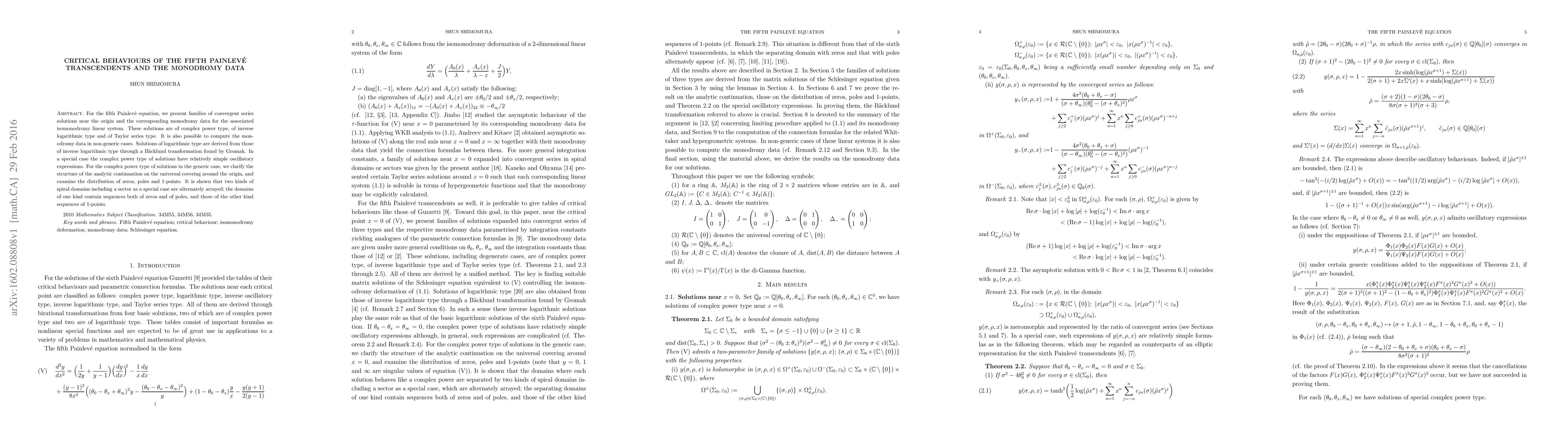 For the fifth Painlev\'e equation, we present families of convergent series solutions near the origin and the corresponding monodromy data for the associated isomonodromy linear system. These solutions are of complex power type, of inverse logarithmic type and of Taylor series type. It is also possible to compute the monodromy data in non-generic cases. Solutions of logarithmic type are derived from those of inverse logarithmic type through a B\"{a}cklund transformation found by Gromak. In a special case the complex power type of solutions have relatively simple oscillatory expressions. For the complex power type of solutions in the generic case, we clarify the structure of the analytic continuation on the universal covering around the origin, and examine the distribution of zeros, poles and 1-points. It is shown that two kinds of spiral domains including a sector as a special case are alternately arrayed; the domains of one kind contain sequences both of zeros and of poles, and those of the other kind sequences of 1-points.