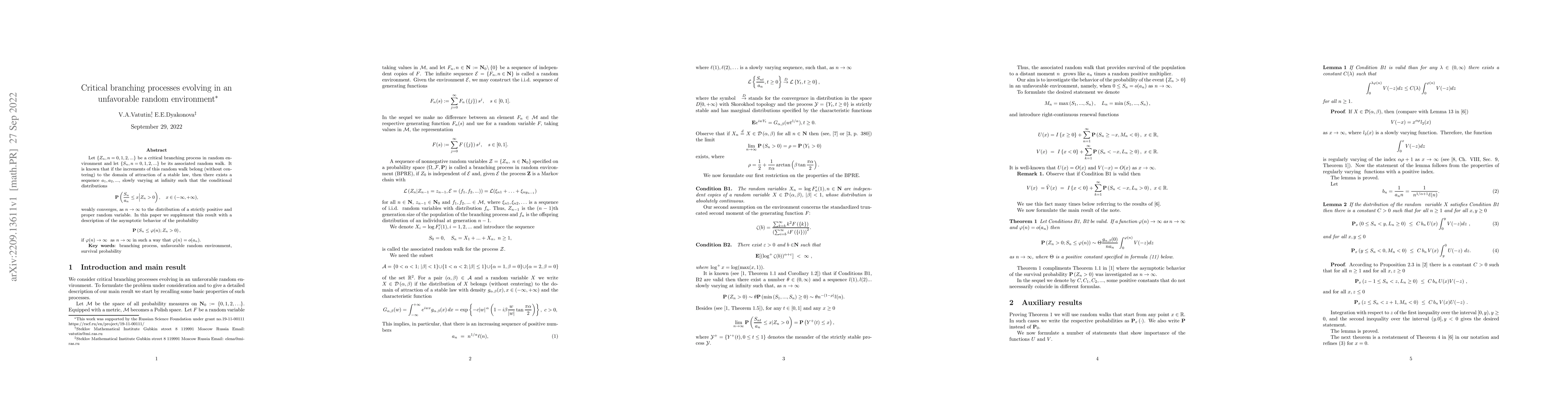 This paper investigates the asymptotic behavior of a critical branching process in a random environment, showing that under certain conditions on the increments of its associated random walk, the probability of the random walk remaining below a function of n converges to a strictly positive random variable, provided the function grows slower than a scaling sequence derived from the process.