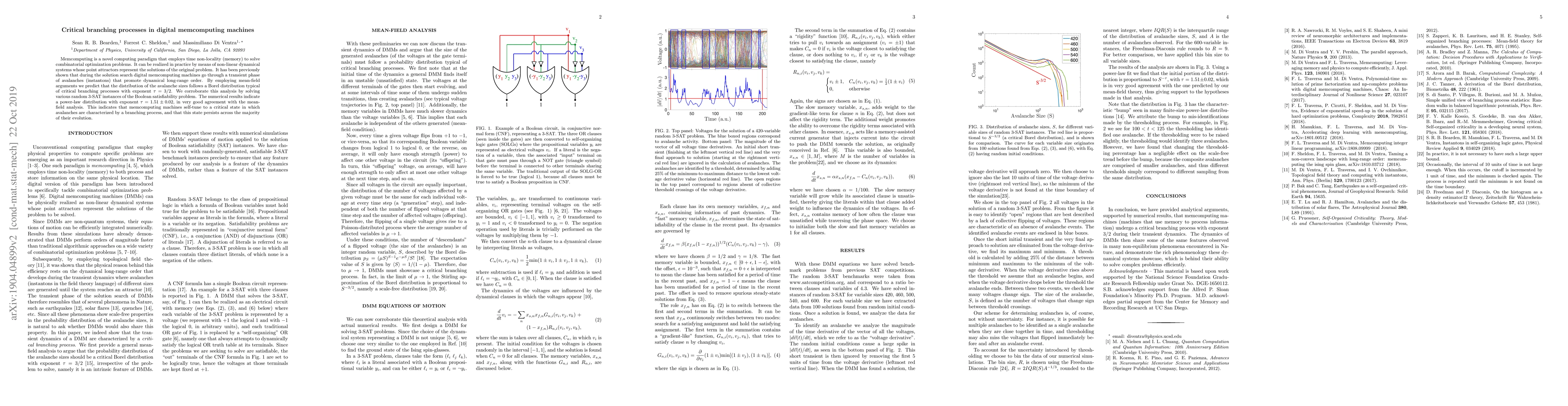 This paper explores the critical branching processes in digital memcomputing machines, showing that they self-tune to a critical state where the distribution of avalanche sizes follows a Borel distribution with exponent $\tau=3/2$. Numerical results from solving random 3-SAT instances corroborate this, finding a power-law distribution with exponent $\tau = 1.51 \pm 0.02$.
