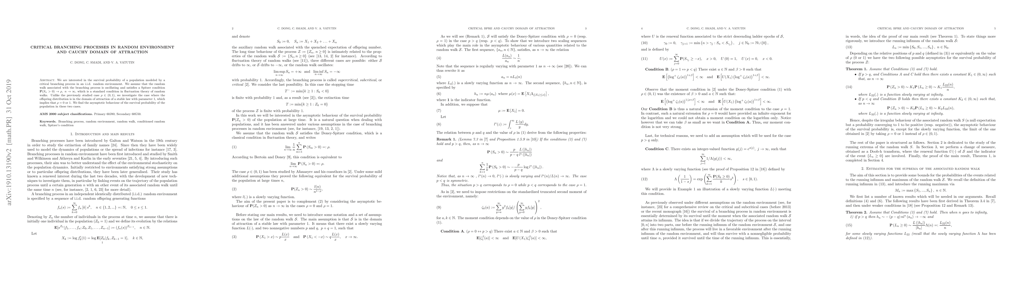We are interested in the survival probability of a population modeled by a critical branching process in an i.i.d. random environment. We assume that the random walk associated with the branching process is oscillating and satisfies a Spitzer condition $\mathbf{P}(S_{n}>0)\rightarrow \rho ,\ n\rightarrow \infty $, which is a standard condition in fluctuation theory of random walks. Unlike the previously studied case $\rho \in (0,1)$, we investigate the case where the offspring distribution is in the domain of attraction of a stable law with parameter $1$, which implies that $\rho =0$ or $1$. We find the asymptotic behaviour of the survival probability of the population in these two cases.