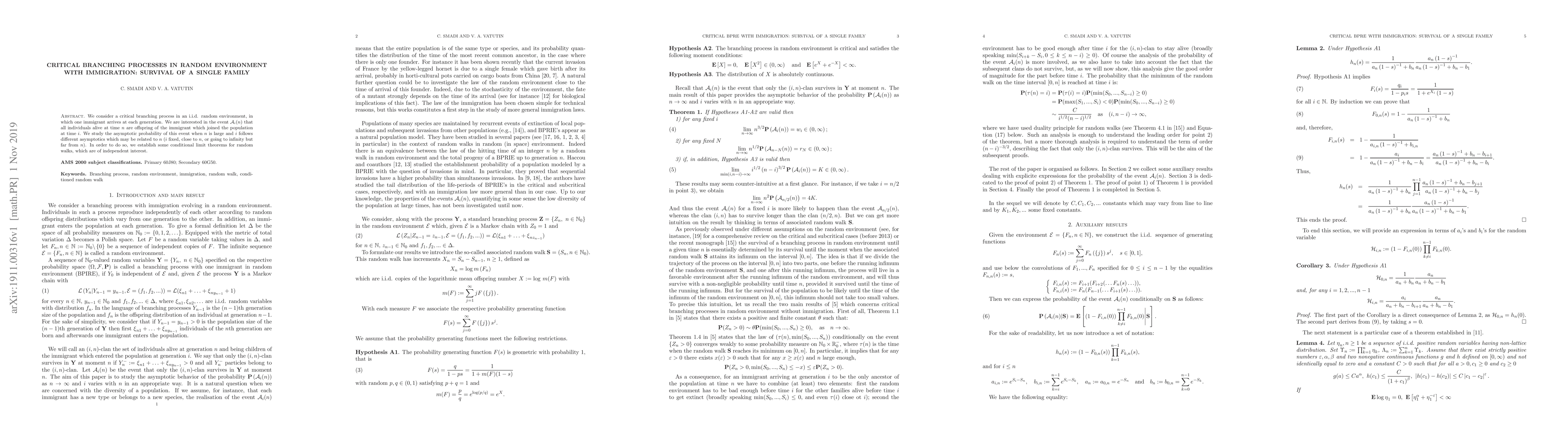 We consider a critical branching process in an i.i.d. random environment, in which one immigrant arrives at each generation. We are interested in the event $\mathcal{A}_i(n)$ that all individuals alive at time $n$ are offspring of the immigrant which joined the population at time $i$. We study the asymptotic probability of this event when $n$ is large and $i$ follows different asymptotics which may be related to $n$ ($i$ fixed, close to $n$, or going to infinity but far from $n$). In order to do so, we establish some conditional limit theorems for random walks, which are of independent interest.