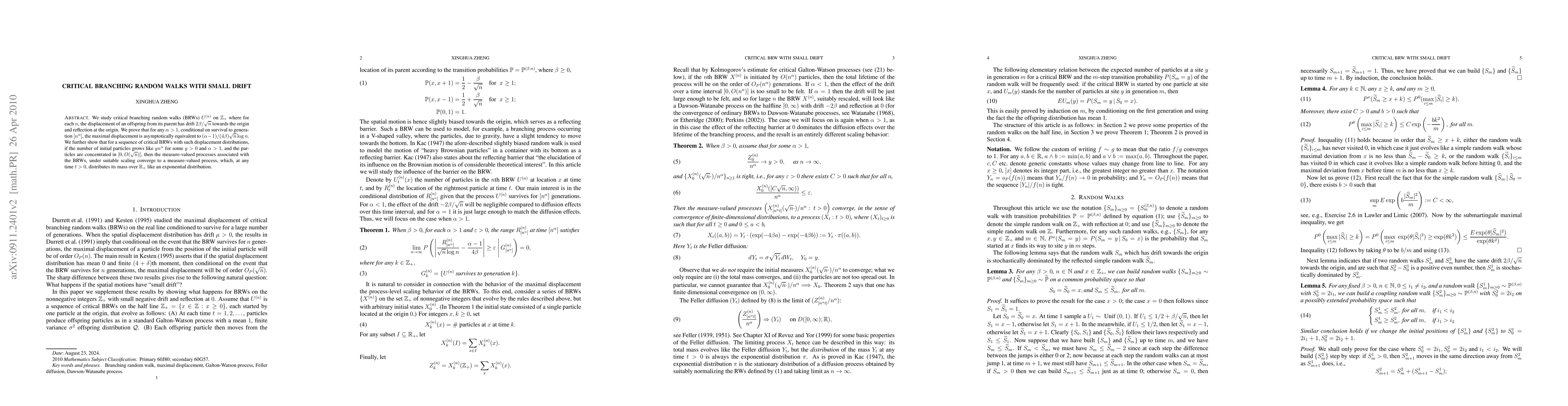 This research paper studies critical branching random walks with small drift, showing that maximal displacement is asymptotically equivalent to a specific formula under certain conditions. It also demonstrates convergence of measure-valued processes to an exponential distribution.