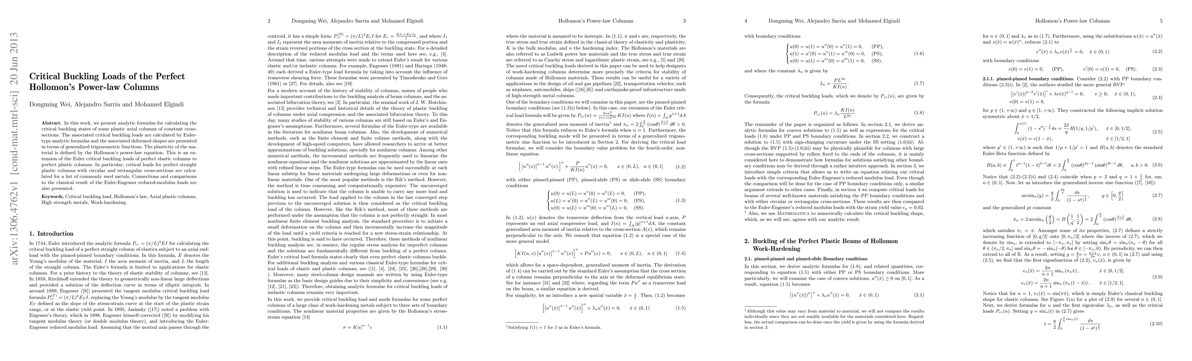 This paper derives analytic formulas for calculating the critical buckling loads of plastic axial columns defined by Hollomon's power-law, extending Euler's critical loads for elastic columns to plastic behavior. The study focuses on straight columns with circular and rectangular cross-sections, comparing results to classical Euler-Engesser reduced-modulus loads.