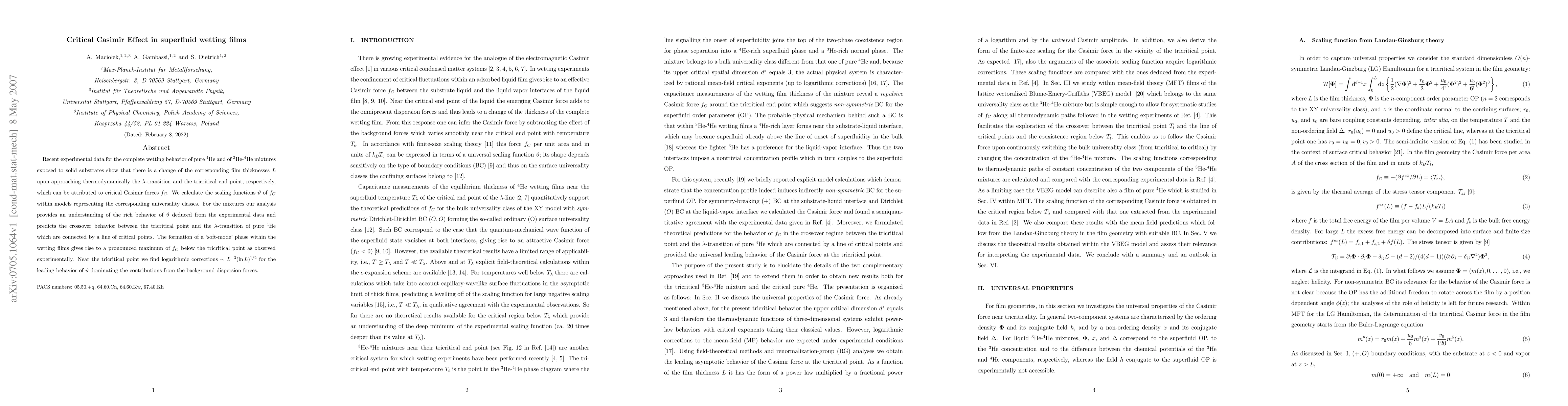The paper presents a detailed analysis of the critical Casimir effect in superfluid wetting films using both MFT and renormalization group techniques, deriving scaling functions and predicting crossover behavior.