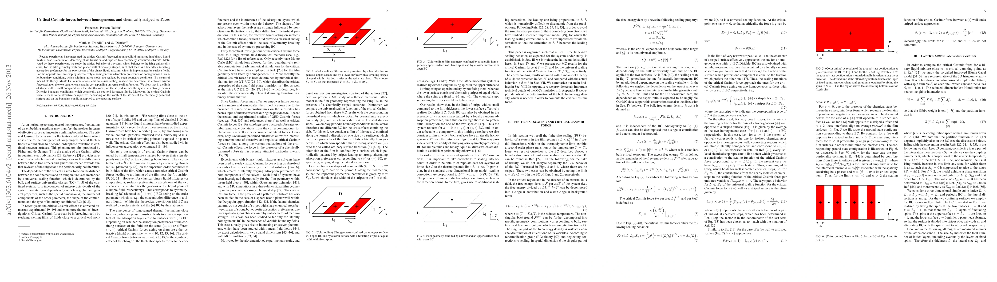 Recent experiments have measured the critical Casimir force acting on a colloid immersed in a binary liquid mixture near its continuous demixing phase transition and exposed to a chemically structured substrate. Motivated by these experiments, we study the critical behavior of a system, which belongs to the Ising universality class, for the film geometry with one planar wall chemically striped, such that there is a laterally alternating adsorption preference for the two species of the binary liquid mixture, which is implemented by surface fields. For the opposite wall we employ alternatively a homogeneous adsorption preference or homogeneous Dirichlet boundary conditions, which within a lattice model are realized by open boundary conditions. By means of mean-field theory, Monte Carlo simulations, and finite-size scaling analysis we determine the critical Casimir force acting on the two parallel walls and its corresponding universal scaling function. We show that in the limit of stripe widths small compared with the film thickness, on the striped surface the system effectively realizes Dirichlet boundary conditions, which generically do not hold for actual fluids. Moreover, the critical Casimir force is found to be attractive or repulsive, depending on the width of the stripes of the chemically patterned surface and on the boundary condition applied to the opposing surface.