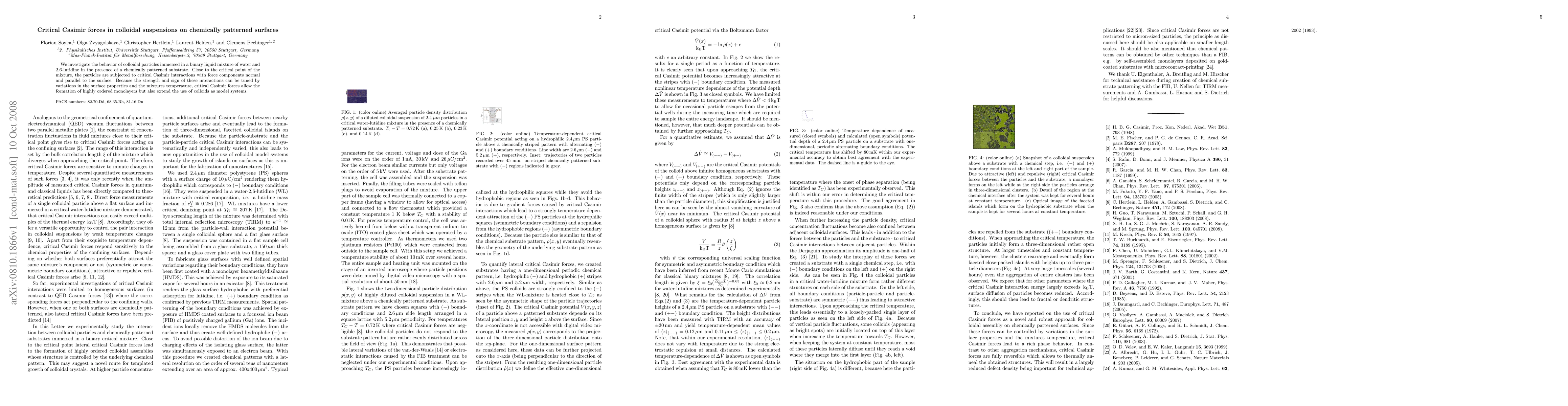 We investigate the behavior of colloidal particles immersed in a binary liquid mixture of water and 2,6-lutidine in the presence of a chemically patterned substrate. Close to the critical point of the mixture, the particles are subjected to critical Casimir interactions with force components normal and parallel to the surface. Because the strength and sign of these interactions can be tuned by variations in the surface properties and the mixtures temperature, critical Casimir forces allow the formation of highly ordered monolayers but also extend the use of colloids as model systems.
