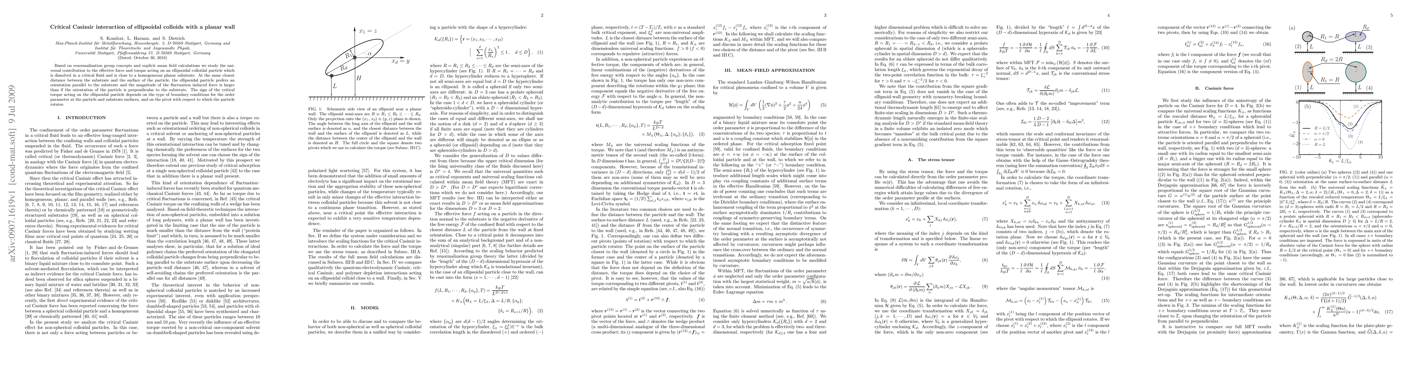 Based on renormalization group concepts and explicit mean field calculations we study the universal contribution to the effective force and torque acting on an ellipsoidal colloidal particle which is dissolved in a critical fluid and is close to a homogeneous planar substrate. At the same closest distance between the substrate and the surface of the particle, the ellipsoidal particle prefers an orientation parallel to the substrate and the magnitude of the fluctuation induced force is larger than if the orientation of the particle is perpendicular to the substrate. The sign of the critical torque acting on the ellipsoidal particle depends on the type of boundary conditions for the order parameter at the particle and substrate surfaces, and on the pivot with respect to which the particle rotates.