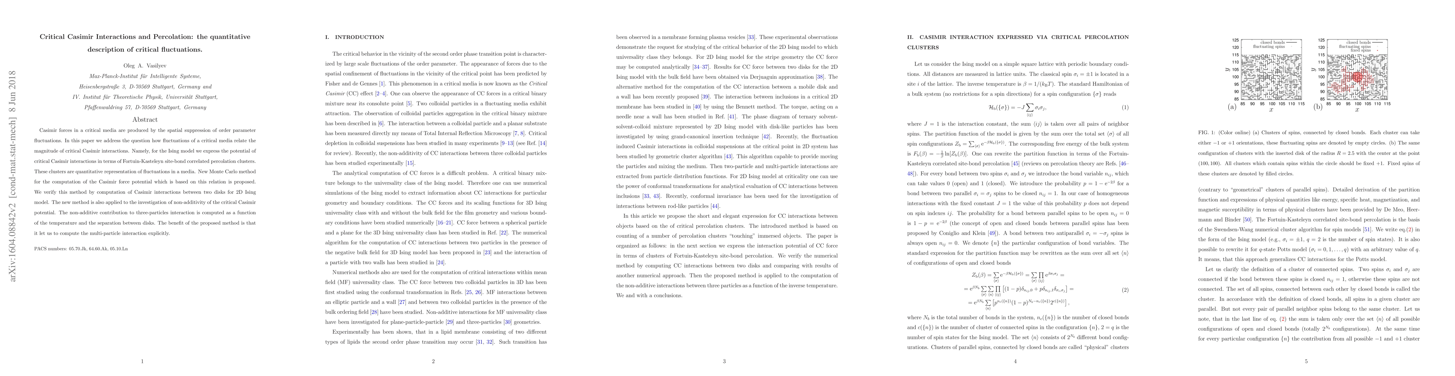 This paper explores the relationship between critical fluctuations and critical Casimir interactions in the Ising model, using Fortuin-Kasteleyn site-bond correlated percolation clusters to quantify fluctuations. A new Monte Carlo method is proposed to compute the Casimir force potential, validated by calculating interactions between two disks in the 2D Ising model and investigating non-additive contributions to three-particle interactions.