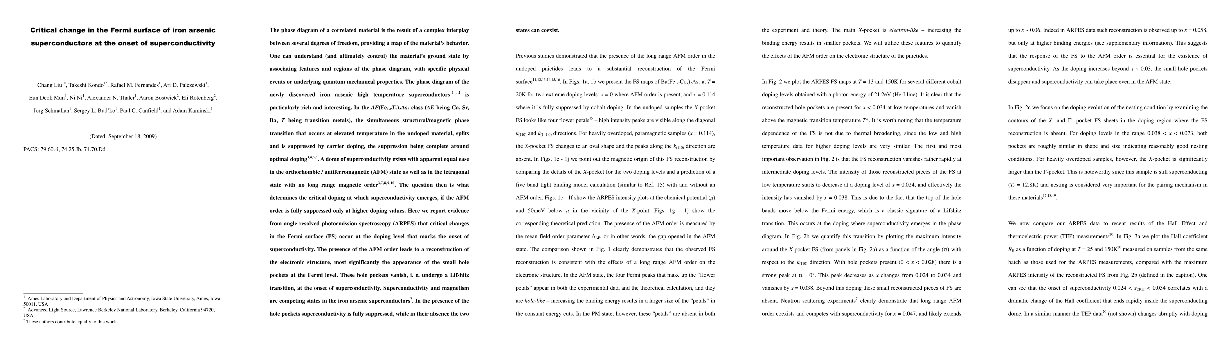 This paper reports that critical changes in the Fermi surface of iron arsenic superconductors occur at the doping level marking the onset of superconductivity, as evidenced by ARPES. The antiferromagnetic order leads to the appearance of small hole pockets, which vanish at the onset of superconductivity, indicating that superconductivity and magnetism are competing states.