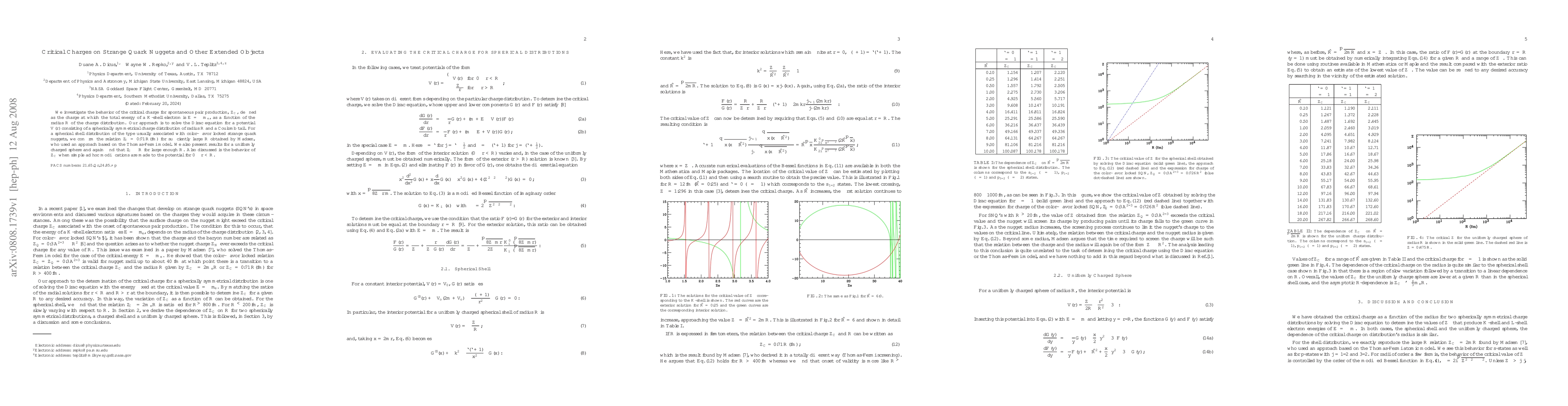 We investigate the behavior of the critical charge for spontaneous pair production, $Z_C$, defined as the charge at which the total energy of a $K$-shell electron is $E=-m_e$, as a function of the radius $R$ of the charge distribution. Our approach is to solve the Dirac equation for a potential $V(r)$ consisting of a spherically symmetrical charge distribution of radius $R$ and a Coulomb tail. For a spherical shell distribution of the type usually associated with color-flavor locked strange quark nuggets, we confirm the relation $Z_C=0.71 R({\rm fm})$ for sufficiently large $R$ obtained by Madsen, who used an approach based on the Thomas-Fermi model. We also present results for a uniformly charged sphere and again find that $Z_C\sim R$ for large enough $R$. Also discussed is the behavior of $Z_C$ when simple {\it ad hoc} modifications are made to the potential for $0\leq r < R$.