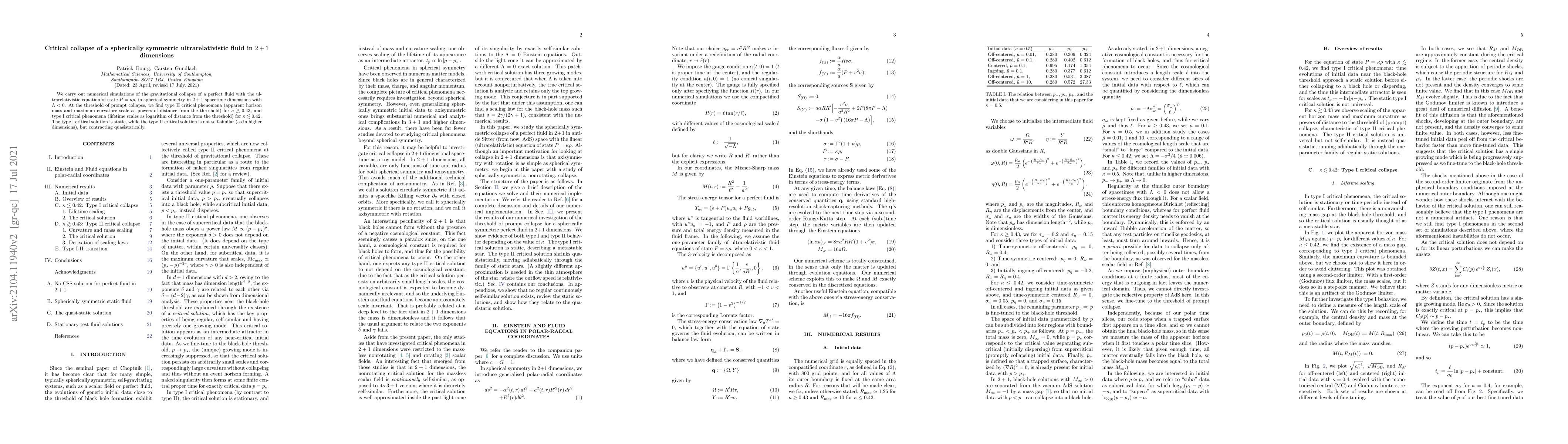 Researchers simulated gravitational collapse in 2+1 dimensions, finding two types of critical phenomena depending on the ultrarelativistic equation of state parameter ε. Type I critical solutions exhibit static behavior, while type II solutions show non-self-similar contraction.