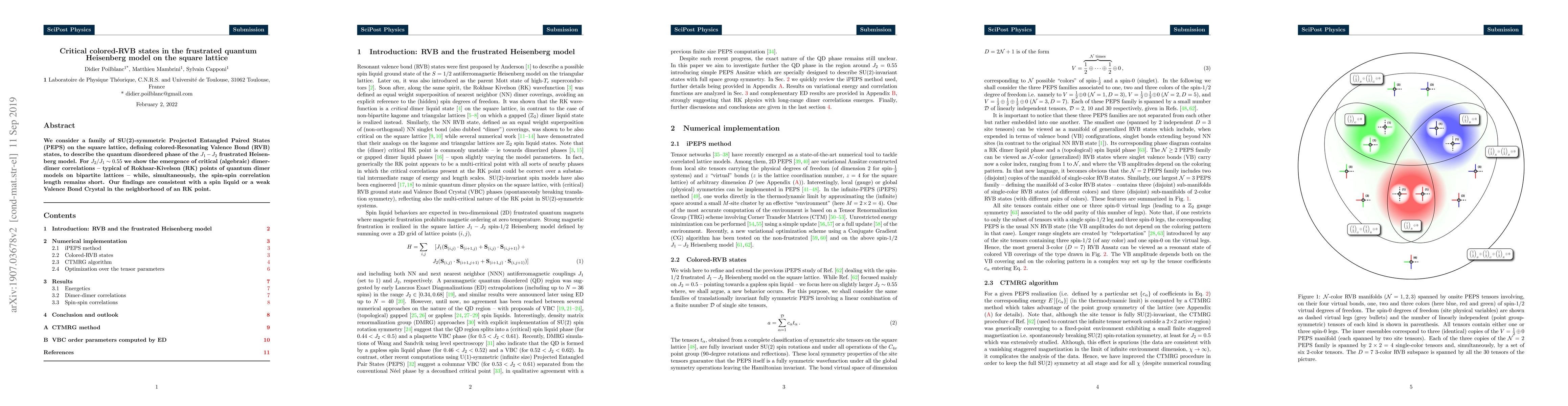 We consider a family of SU(2)-symmetric Projected Entangled Paired States (PEPS) on the square lattice, defining colored-Resonating Valence Bond (RVB) states, to describe the quantum disordered phase of the $J_1-J_2$ frustrated Heisenberg model.For $J_2/J_1\sim 0.55$ we show the emergence of critical (algebraic) dimer-dimer correlations -- typical of Rokhsar-Kivelson (RK) points of quantum dimer models on bipartite lattices -- while, simultaneously, the spin-spin correlation length remains short. Our findings are consistent with a spin liquid or a weak Valence Bond Crystal in the neighborhood of an RK point.