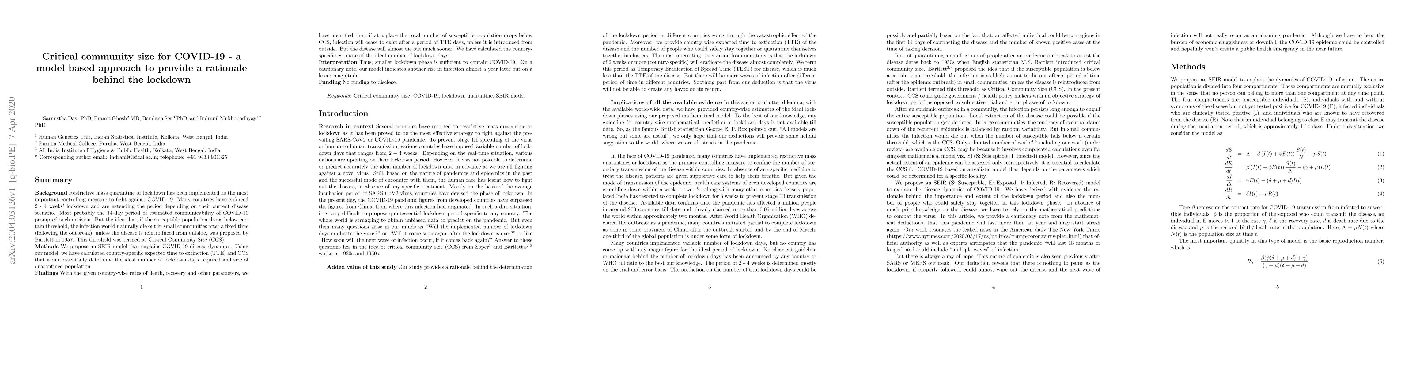 Background: Restrictive mass quarantine or lockdown has been implemented as the most important controlling measure to fight against COVID-19. Many countries have enforced 2 - 4 weeks' lockdown and are extending the period depending on their current disease scenario. Most probably the 14-day period of estimated communicability of COVID-19 prompted such decision. But the idea that, if the susceptible population drops below certain threshold, the infection would naturally die out in small communities after a fixed time (following the outbreak), unless the disease is reintroduced from outside, was proposed by Bartlett in 1957. This threshold was termed as Critical Community Size (CCS). Methods: We propose an SEIR model that explains COVID-19 disease dynamics. Using our model, we have calculated country-specific expected time to extinction (TTE) and CCS that would essentially determine the ideal number of lockdown days required and size of quarantined population. Findings: With the given country-wise rates of death, recovery and other parameters, we have identified that, if at a place the total number of susceptible population drops below CCS, infection will cease to exist after a period of TTE days, unless it is introduced from outside. But the disease will almost die out much sooner. We have calculated the country-specific estimate of the ideal number of lockdown days. Thus, smaller lockdown phase is sufficient to contain COVID-19. On a cautionary note, our model indicates another rise in infection almost a year later but on a lesser magnitude.