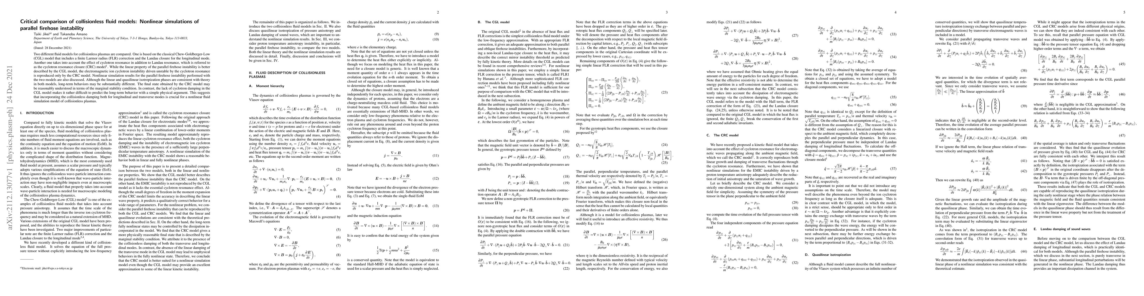 This paper compares two fluid models for collisionless plasmas, highlighting the strengths and limitations of each in simulating the parallel firehose instability. The CGL model better captures linear properties but fails to reproduce the electromagnetic ion cyclotron instability driven by cyclotron resonance, while the CRC model successfully models this instability. Nonlinear simulations reveal differing long-term behaviors, underscoring the importance of incorporating collisionless damping for accurate predictions.