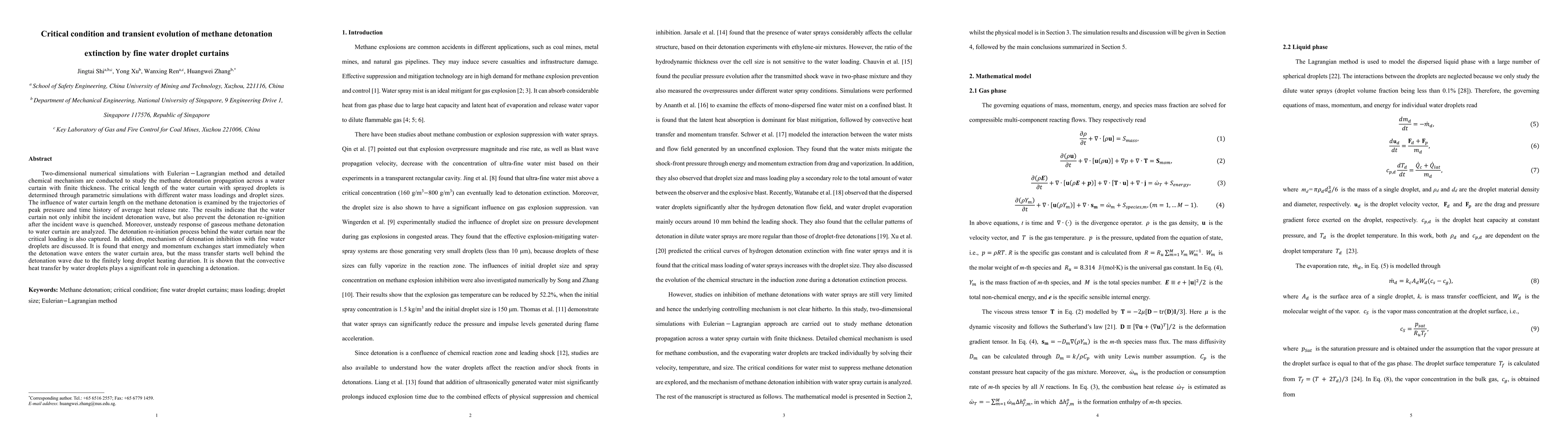 This paper investigates the inhibition of methane detonation by fine water droplet curtains using numerical simulations. It finds that the water curtain effectively prevents both the incident detonation wave and its re-ignition, with convective heat transfer by droplets playing a crucial role in quenching the detonation.