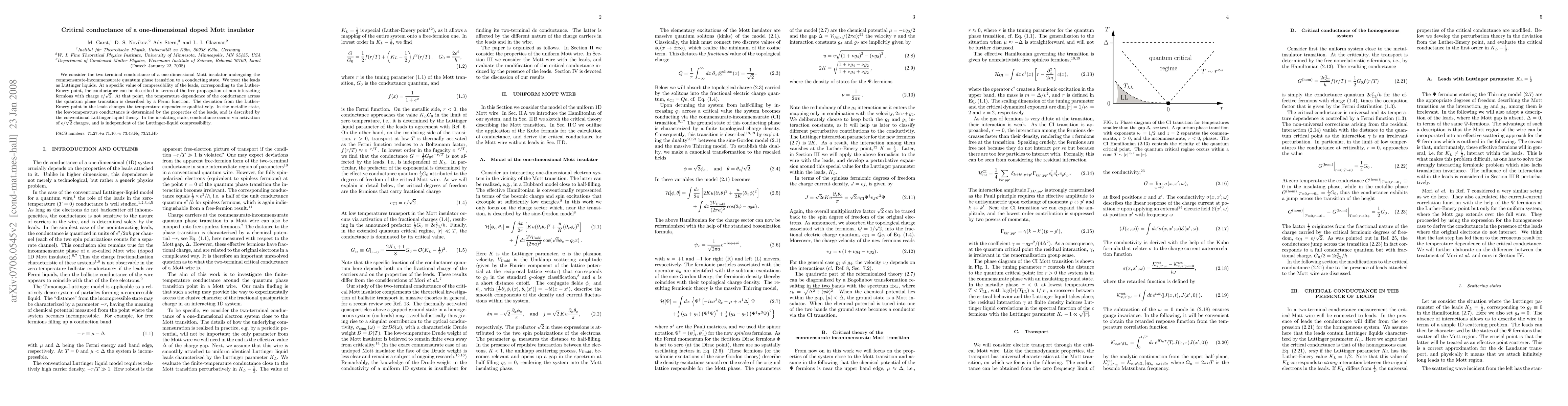 This paper investigates the critical conductance of a one-dimensional doped Mott insulator undergoing a quantum phase transition, finding that at the Luther-Emery point, conductance is non-interacting fermions with charge e/√2, while deviations alter temperature dependence. In the metallic state, conductance follows Luttinger liquid theory, while in the insulating state, it activates e/√2 charges.