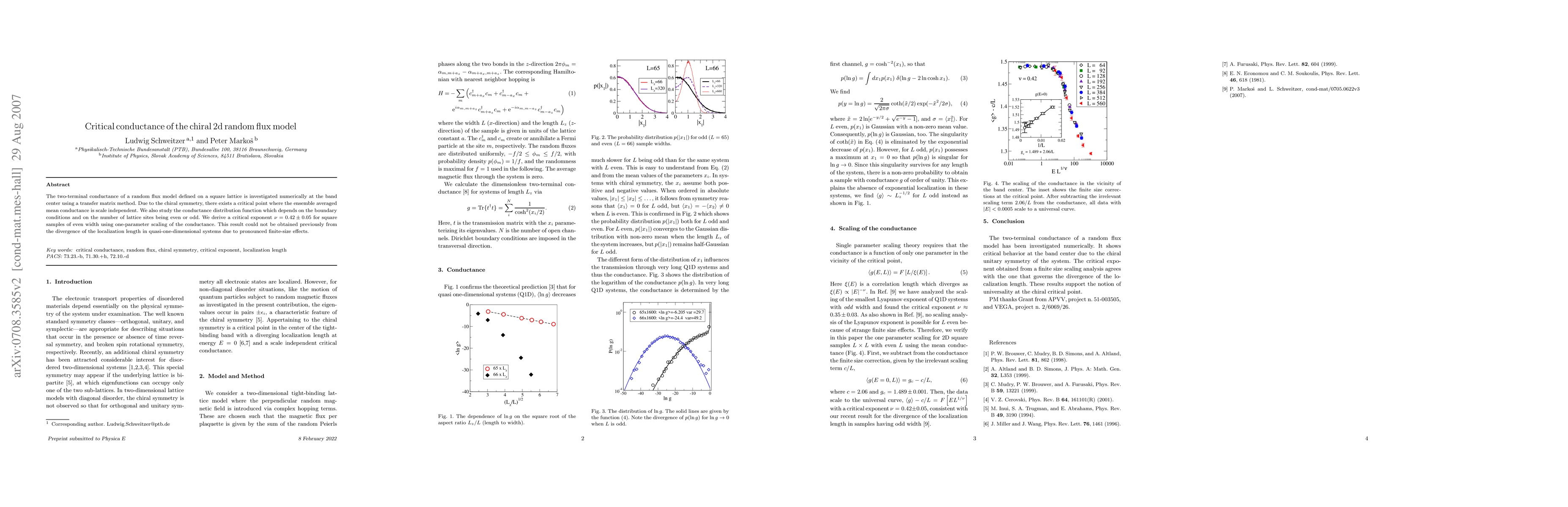 The two-terminal conductance of a random flux model defined on a square lattice is investigated numerically at the band center using a transfer matrix method. Due to the chiral symmetry, there exists a critical point where the ensemble averaged mean conductance is scale independent. We also study the conductance distribution function which depends on the boundary conditions and on the number of lattice sites being even or odd. We derive a critical exponent $\nu=0.42\pm 0.05$ for square samples of even width using one-parameter scaling of the conductance. This result could not be obtained previously from the divergence of the localization length in quasi-one-dimensional systems due to pronounced finite-size effects.