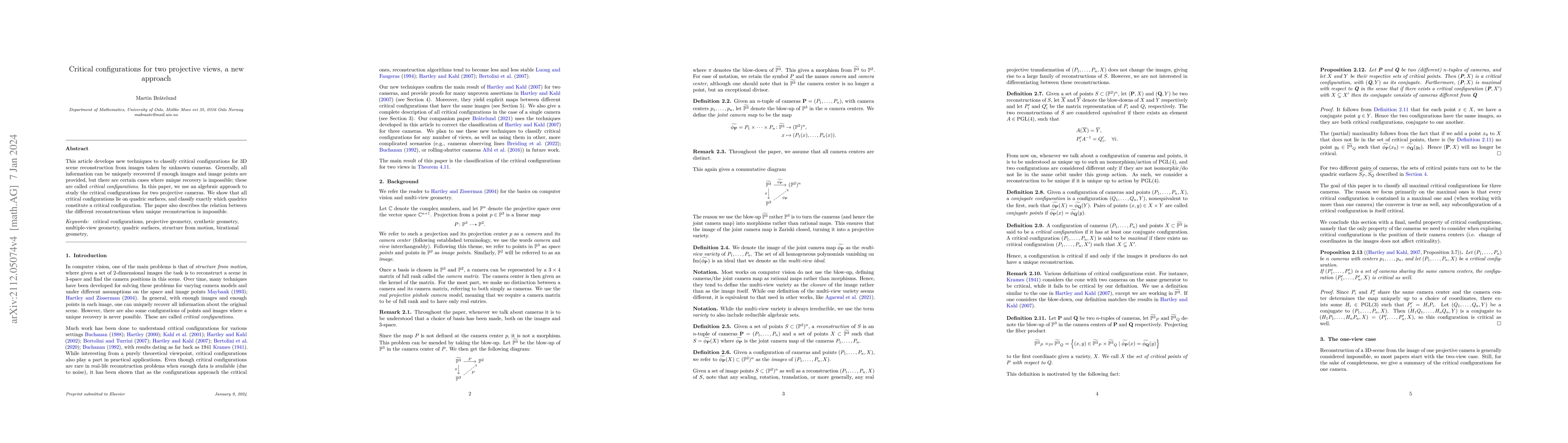 This paper investigates critical configurations for structure from motion using two projective views, demonstrating that these configurations lie on quadric surfaces and classifying the specific quadrics involved. It also explores the relationships between different reconstructions when unique recovery is not possible.