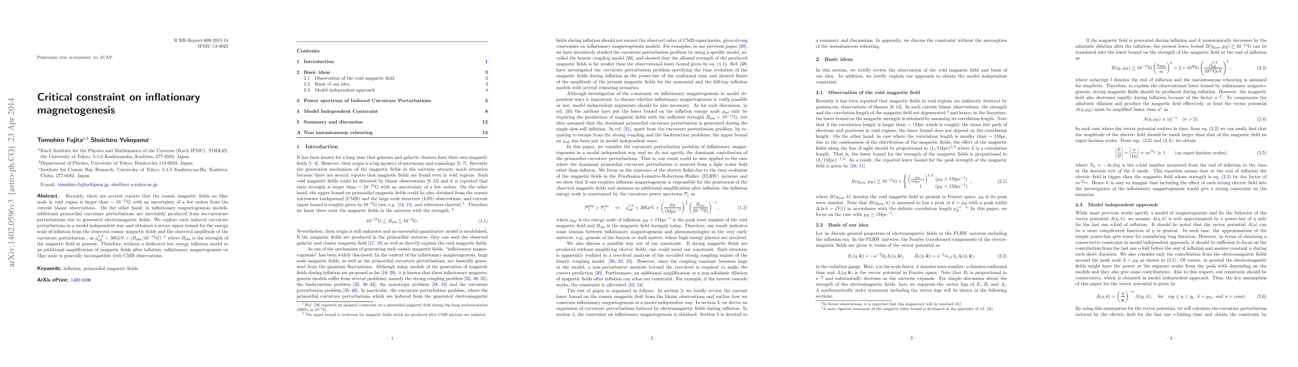 This research paper establishes a stringent upper limit on the energy scale of inflation, finding that inflationary magnetogenesis on Mpc scales conflicts with CMB observations unless a specific low energy inflation model or post-inflation magnetic field amplification exists. The upper bound is derived from cosmic magnetic field observations and the amplitude of primordial curvature perturbations.