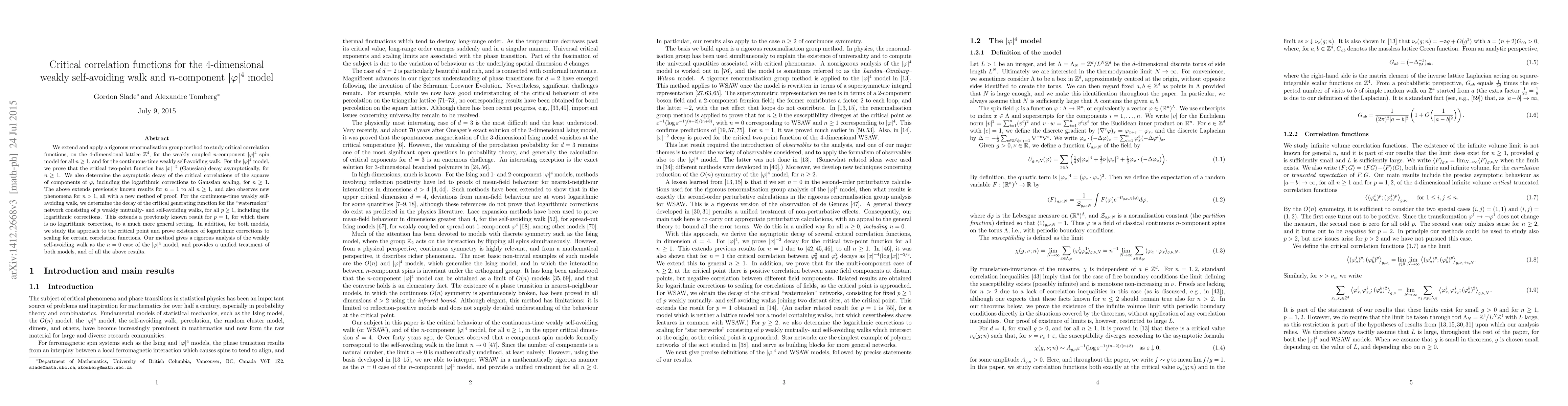 We extend and apply a rigorous renormalisation group method to study critical correlation functions, on the 4-dimensional lattice $\mathbb{Z}^4$, for the weakly coupled $n$-component $|\varphi|^4$ spin model for all $n \geq 1$, and for the continuous-time weakly self-avoiding walk. For the $|\varphi|^4$ model, we prove that the critical two-point function has $|x|^{-2}$ (Gaussian) decay asymptotically, for $n \ge 1$. We also determine the asymptotic decay of the critical correlations of the squares of components of $\varphi$, including the logarithmic corrections to Gaussian scaling, for $n \geq 1$. The above extends previously known results for $n = 1$ to all $n \ge 1$, and also observes new phenomena for $n > 1$, all with a new method of proof. For the continuous-time weakly self-avoiding walk, we determine the decay of the critical generating function for the "watermelon" network consisting of p weakly mutually- and self-avoiding walks, for all $p \ge 1$, including the logarithmic corrections. This extends a previously known result for $p = 1$, for which there is no logarithmic correction, to a much more general setting. In addition, for both models, we study the approach to the critical point and prove existence of logarithmic corrections to scaling for certain correlation functions. Our method gives a rigorous analysis of the weakly self-avoiding walk as the $n = 0$ case of the $|\varphi|^4$ model, and provides a unified treatment of both models, and of all the above results.