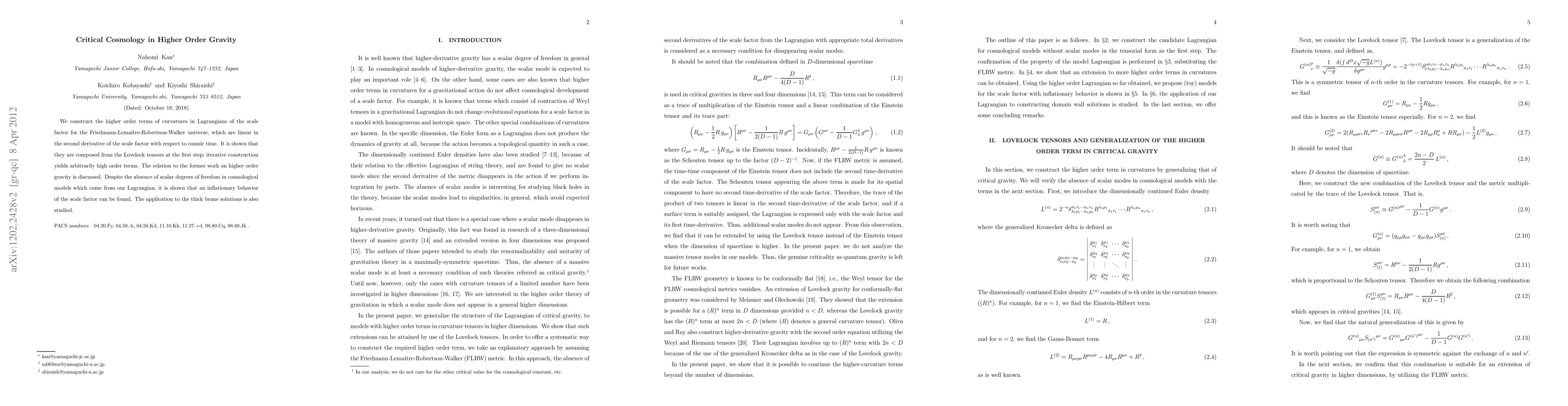 We construct the higher order terms of curvatures in Lagrangians of the scale factor for the Friedmann-Lemaitre-Robertson-Walker universe, which are linear in the second derivative of the scale factor with respect to cosmic time. It is shown that they are composed from the Lovelock tensors at the first step; iterative construction yields arbitrarily high order terms. The relation to the former work on higher order gravity is discussed. Despite the absence of scalar degrees of freedom in cosmological models which come from our Lagrangian, it is shown that an inflationary behavior of the scale factor can be found. The application to the thick brane solutions is also studied.