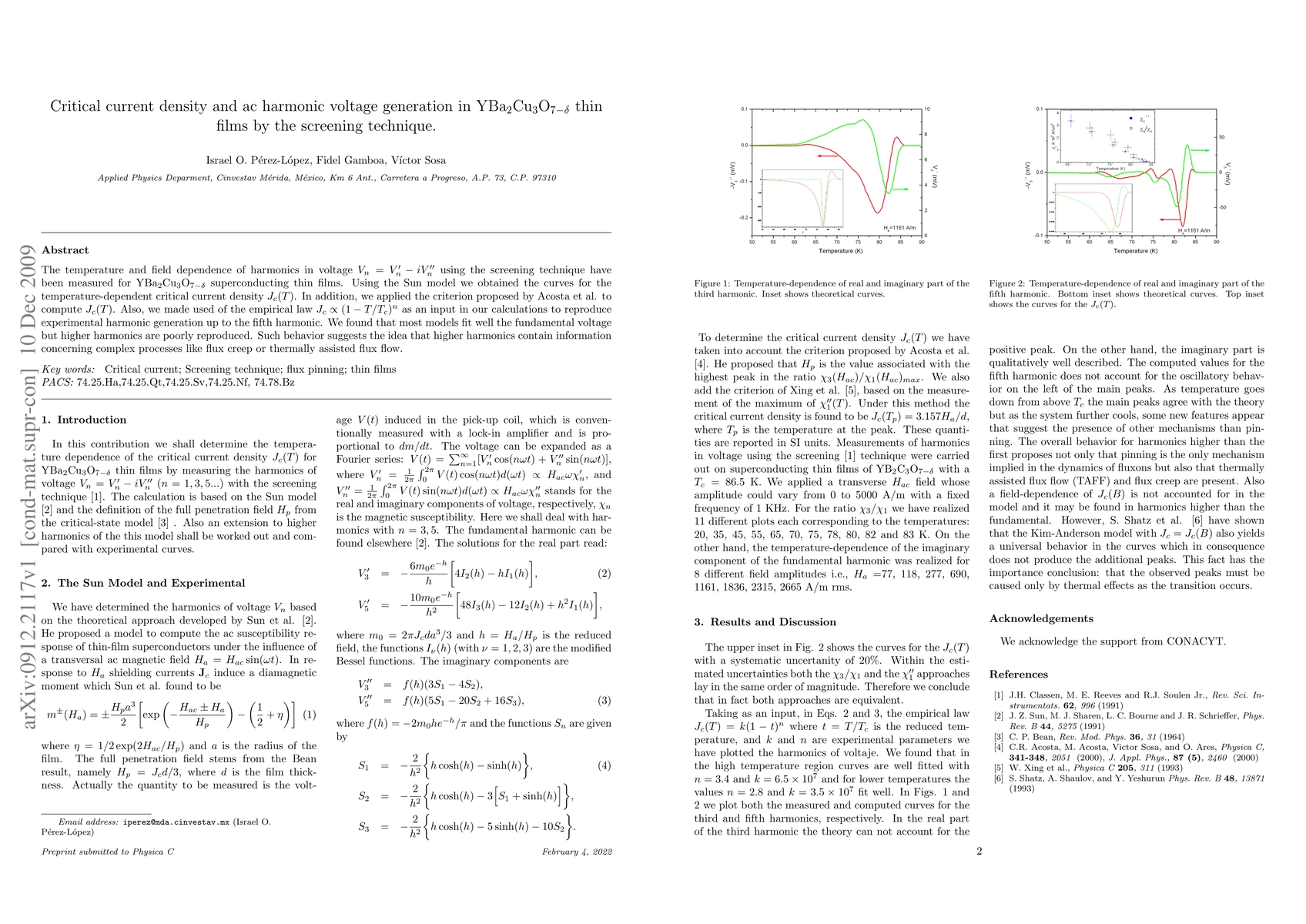 The temperature and field dependence of harmonics in voltage $V_n=V'_n-iV"_n$ using the screening technique have been measured for $\mathrm{Y}\mathrm{Ba}_{2}\mathrm{Cu}_3\mathrm{O}_{7-\delta}$ superconducting thin films. Using the Sun model we obtained the curves for the temperature-dependent critical current density $J_c(T)$. In addition, we applied the criterion proposed by Acosta et al. to compute $J_c(T)$. Also, we made used of the empirical law $J_c \propto (1-T/T_c)^n$ as an input in our calculations to reproduce experimental harmonic generation up to the fifth harmonic. We found that most models fit well the fundamental voltage but higher harmonics are poorly reproduced. Such behavior suggests the idea that higher harmonics contain information concerning complex processes like flux creep or thermally assisted flux flow.