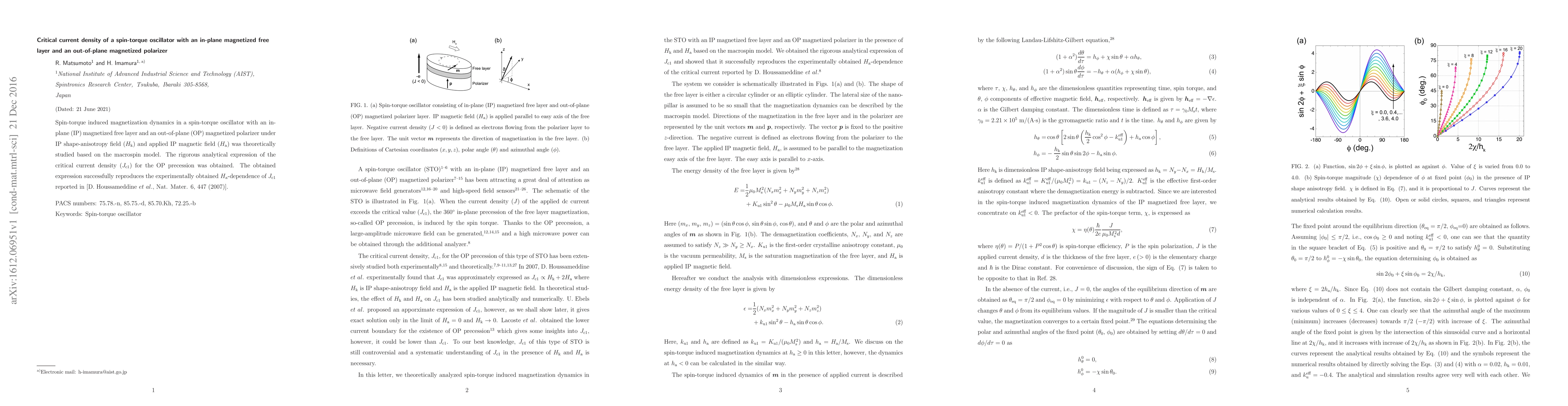 This paper theoretically investigates the spin-torque dynamics in a spin-torque oscillator with an in-plane magnetized free layer and an out-of-plane magnetized polarizer, deriving an analytical expression for the critical current density ($J_{\rm c1}$). The derived expression accurately matches experimental results for the $H_{\rm a}$ dependence of $J_{\rm c1}$.
