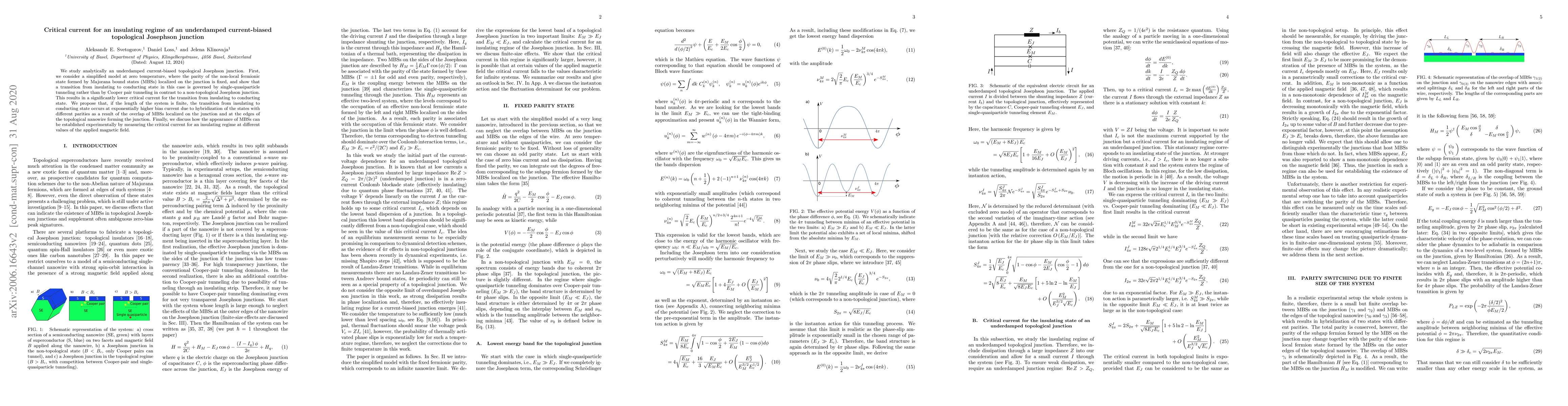 This paper analytically investigates an underdamped current-biased topological Josephson junction, showing that its insulating-to-conducting transition is driven by single-quasiparticle tunneling rather than Cooper pair tunneling. The critical current for this transition is significantly lower, and finite system length may cause an exponentially higher bias current transition due to state hybridization.