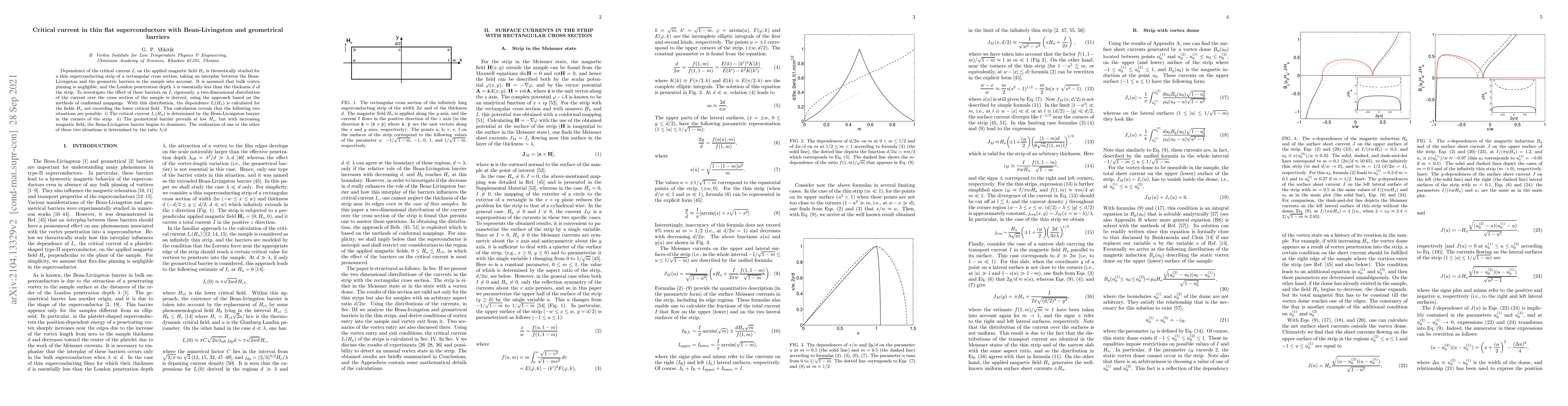This paper theoretically investigates the critical current $I_c$ in thin superconducting strips under applied magnetic fields, considering both Bean-Livingston and geometrical barriers. The study reveals that the critical current behavior depends on the interplay between these barriers, with the dominance shifting from geometrical to Bean-Livingston barriers as the magnetic field increases, influenced by the ratio $\lambda/d$.
