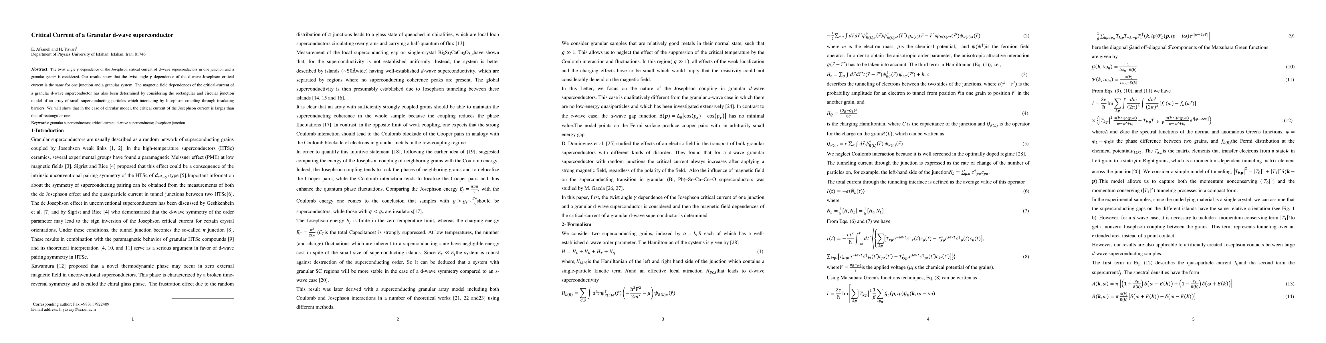 This paper investigates the Josephson critical current in granular d-wave superconductors, finding that the twist angle dependence is consistent across single junctions and granular systems. It also compares the magnetic field dependence of critical current in rectangular versus circular junction models, showing that the circular model yields a higher critical current.