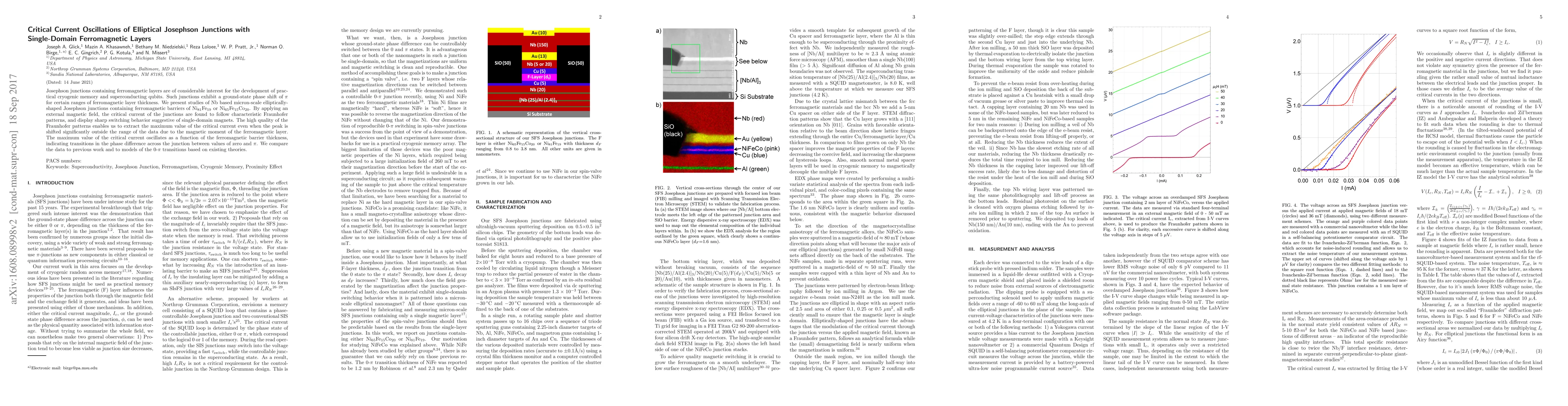 Josephson junctions containing ferromagnetic layers are of considerable interest for the development of practical cryogenic memory and superconducting qubits. Such junctions exhibit a phase shift of $\pi$ for certain ranges of ferromagnetic layer thickness. We present studies of Nb based micron-scale elliptically-shaped Josephson junctions containing ferromagnetic barriers of Ni$_{81}$Fe$_{19}$ or Ni$_{65}$Co$_{20}$Fe$_{15}$. By applying an external magnetic field, the critical current of the junctions are found to follow characteristic Fraunhofer patterns, and display sharp switching behavior suggestive of single-domain magnets. The high quality of the Fraunhofer patterns enables us to extract the maximum value of the critical current even when the peak is shifted significantly outside the range of the data due to the magnetic moment of the ferromagnetic layer. The maximum value of the critical current oscillates as a function of the ferromagnetic barrier thickness, indicating transitions in the phase difference across the junction between values of zero and $\pi$. We compare the data to previous work and to models of the 0-$\pi$ transitions based on existing theories.