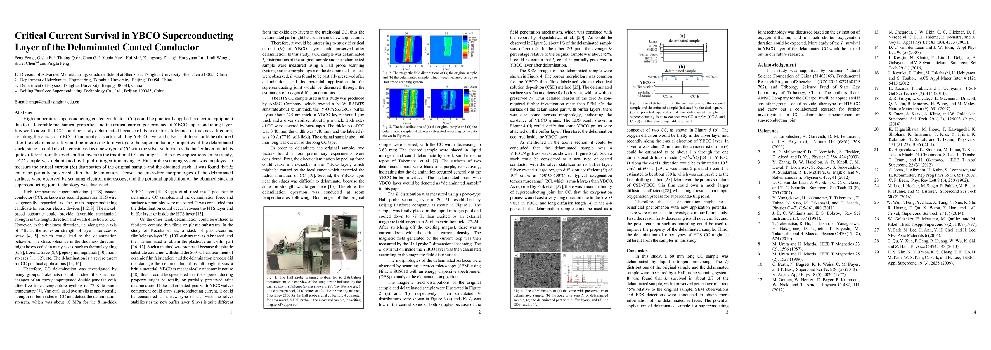 High temperature superconducting coated conductor (CC) could be practically applied in electric equipment due to its favorable mechanical properties and the critical current performance of YBCO superconducting layer. It is well known that CC could be easily delaminated because of its poor stress tolerance in thickness direction, i.e. along the c-axis of YBCO. Commonly, a stack including YBCO layer and silver stabilizer could be obtained after the delamination. It would be interesting to investigate the superconducting properties of the delaminated stack, since it could also be considered as a new type of CC with the silver stabilizer as the buffer layer, which is quite different from the oxide buffer layers in the traditional CC and might lead to new applications. In this study, a CC sample was delaminated by liquid nitrogen immersing. A Hall probe scanning system was employed to measure the critical current (IC) distribution of the original sample and the obtained stack. It was found that IC could be partially preserved after the delamination. Dense and crack-free morphologies of the delaminated surfaces were observed by scanning electron microscopy, and the potential application of the obtained stack in superconducting joint technology was discussed.