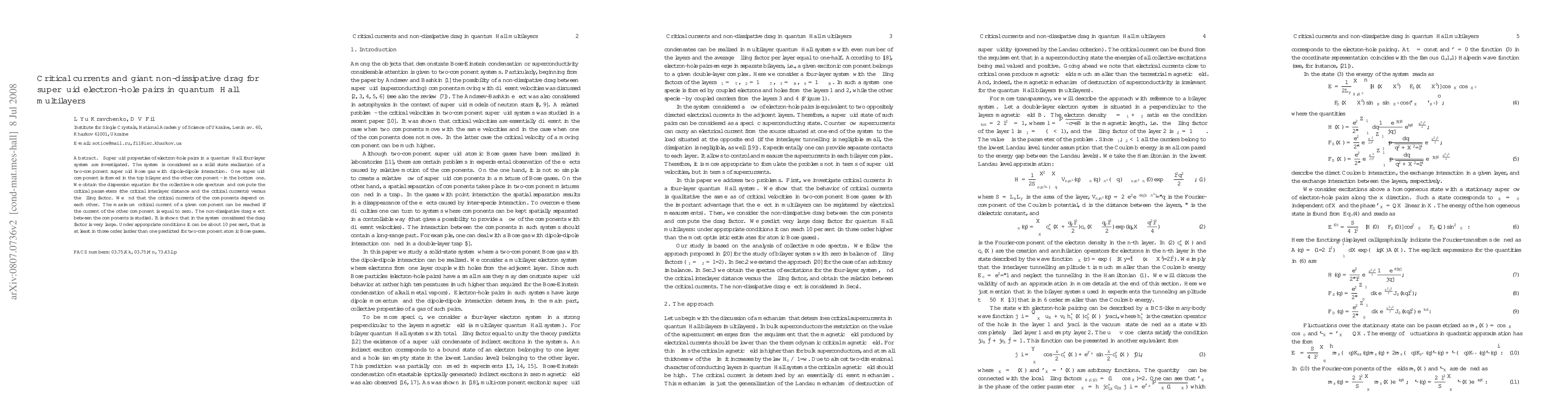 Superfluid properties of electron-hole pairs in a quantum Hall four-layer system are investigated. The system is considered as a solid state realization of a two-component superfluid Bose gas with dipole-dipole interaction. One superfluid component is formed in the top bilayer and the other component - in the bottom one. We obtain the dispersion equation for the collective mode spectrum and compute the critical parameters (the critical interlayer distance and the critical currents) versus the filling factor. We find that the critical currents of the components depend on each other. The maximum critical current of a given component can be reached if the current of the other component is equal to zero. The non-dissipative drag effect between the components is studied. It is shown that in the system considered the drag factor is very large. Under appropriate conditions it can be about 10 per sent, that is at least in three order larder than one predicted for two-component atomic Bose gases.
