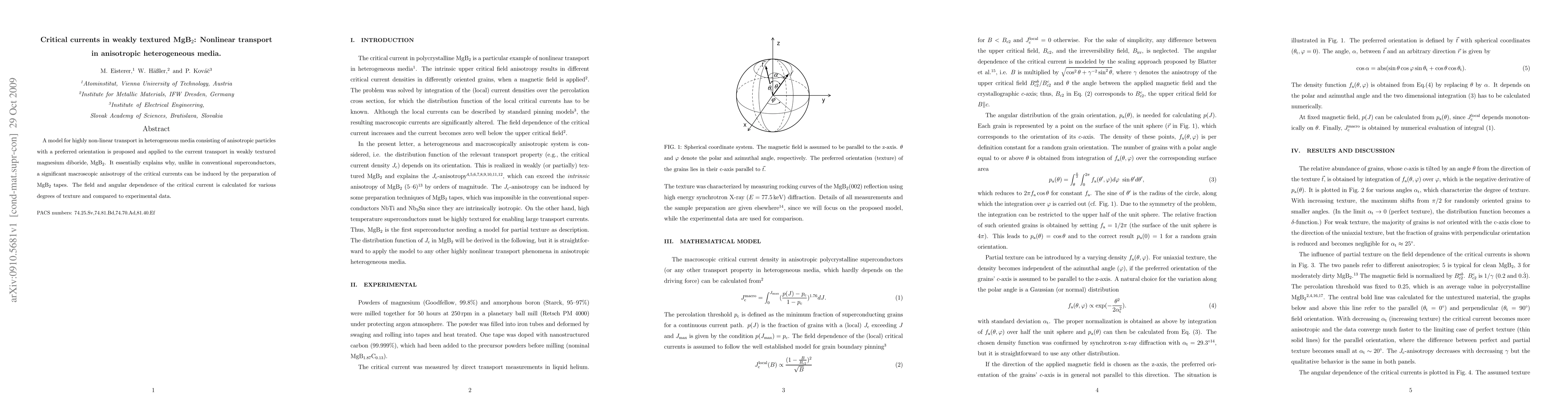 The paper proposes a model explaining non-linear transport in anisotropic, heterogeneous MgB2 tapes, demonstrating how texture can induce significant macroscopic anisotropy in critical currents, and validates the model with experimental data on the field and angular dependence of critical current.