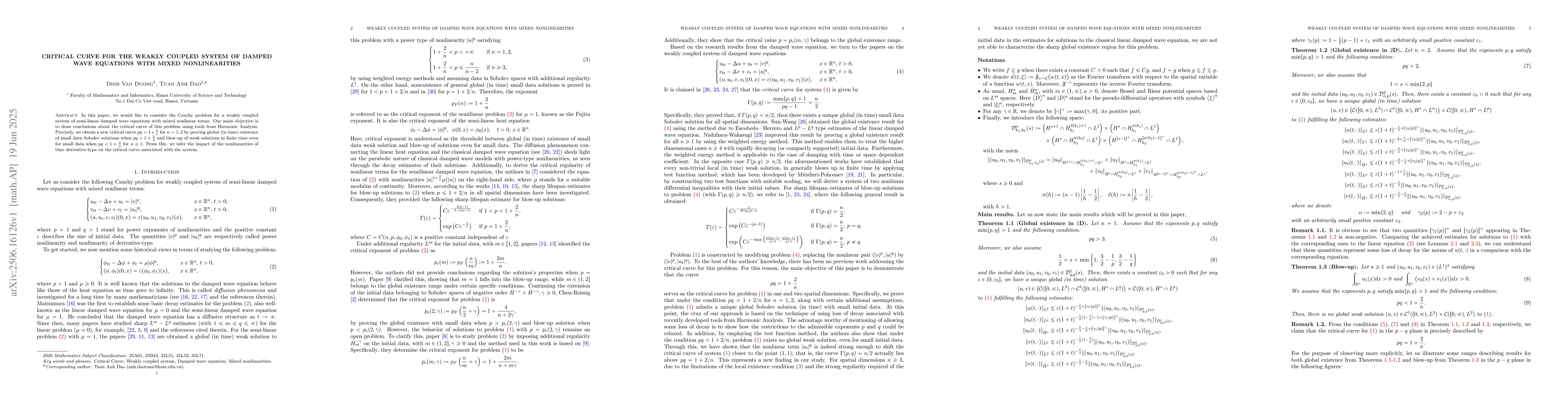 In this paper, we would like to consider the Cauchy problem for a weakly coupled system of semi-linear damped wave equations with mixed nonlinear terms. Our main objective is to draw conclusions about the critical curve of this problem using tools from Harmonic Analysis. Precisely, we obtain a new critical curve $pq = 1+ \frac{2}{n}$ for $n =1,2$ by proving global (in time) existence of small data Sobolev solutions when $pq > 1 +\frac{2}{n}$ and blow-up of weak solutions in finite time even for small data when $pq < 1+ \frac{2}{n}$ for $n \geq 1$. From this, we infer the impact of the nonlinearities of time derivative-type on the critical curve associated with the system.