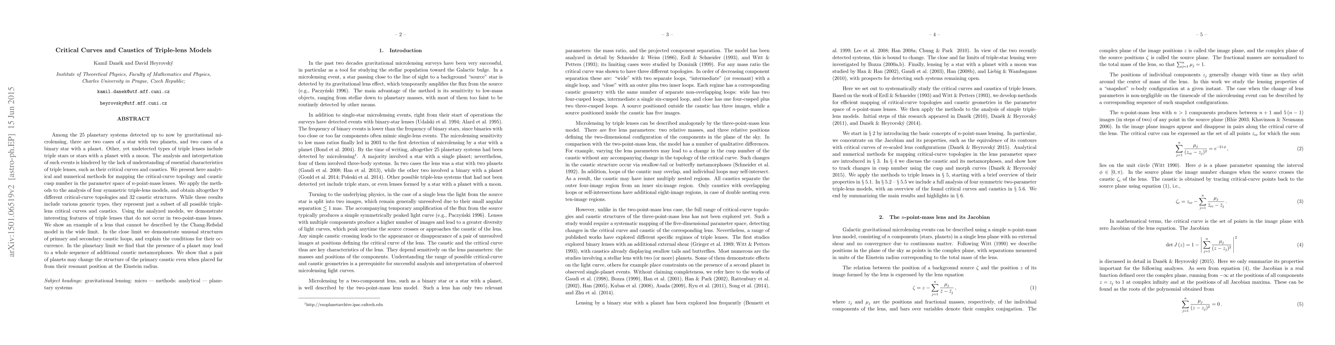 Among the 25 planetary systems detected up to now by gravitational microlensing, there are two cases of a star with two planets, and two cases of a binary star with a planet. Other, yet undetected types of triple lenses include triple stars or stars with a planet with a moon. The analysis and interpretation of such events is hindered by the lack of understanding of essential characteristics of triple lenses, such as their critical curves and caustics. We present here analytical and numerical methods for mapping the critical-curve topology and caustic cusp number in the parameter space of $n$-point-mass lenses. We apply the methods to the analysis of four symmetric triple-lens models, and obtain altogether 9 different critical-curve topologies and 32 caustic structures. While these results include various generic types, they represent just a subset of all possible triple-lens critical curves and caustics. Using the analyzed models, we demonstrate interesting features of triple lenses that do not occur in two-point-mass lenses. We show an example of a lens that cannot be described by the Chang-Refsdal model in the wide limit. In the close limit we demonstrate unusual structures of primary and secondary caustic loops, and explain the conditions for their occurrence. In the planetary limit we find that the presence of a planet may lead to a whole sequence of additional caustic metamorphoses. We show that a pair of planets may change the structure of the primary caustic even when placed far from their resonant position at the Einstein radius.