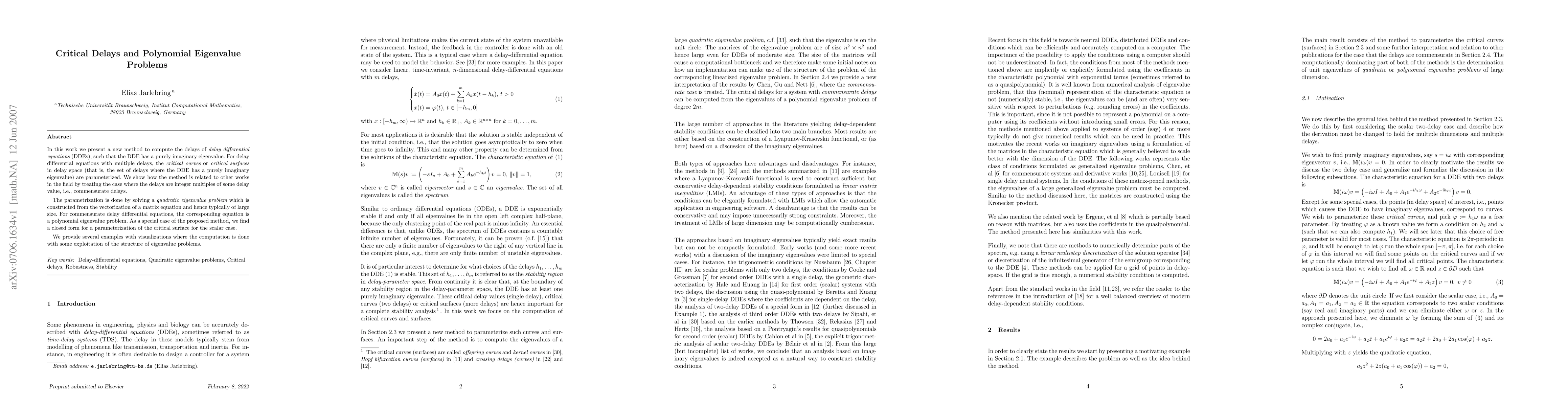 This paper presents a novel method for computing critical delays in delay differential equations (DDEs) with purely imaginary eigenvalues, particularly for equations with multiple delays. The method involves solving a quadratic eigenvalue problem, which is parameterized through a polynomial eigenvalue problem for commensurate delays, and includes a closed-form solution for the scalar case.